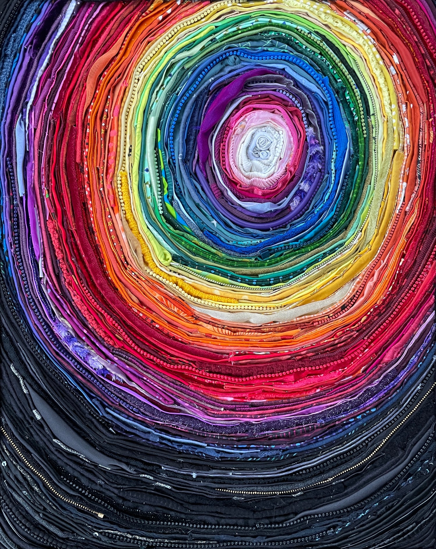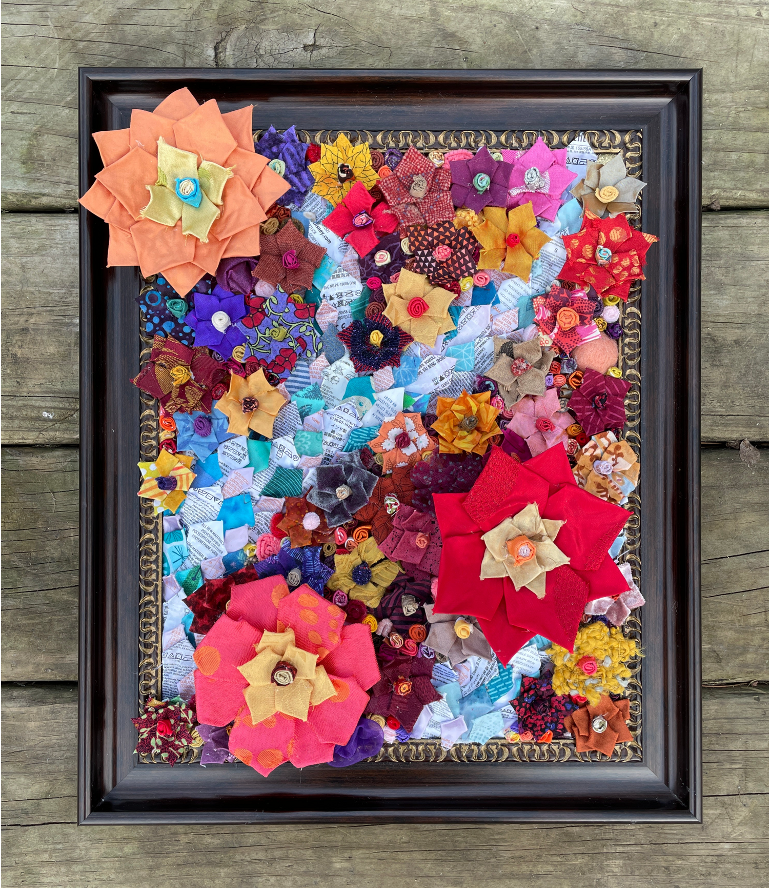 Created using a thrifted globe ring, quilting and other fabric scraps, and over 150 flowers made of unique pieces of upcycled fabric! The piece calls attention to the amount of material already existing in the world that can be repurposed.