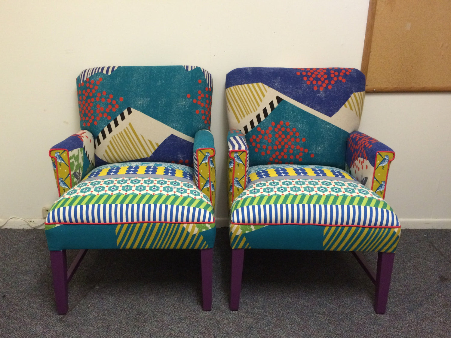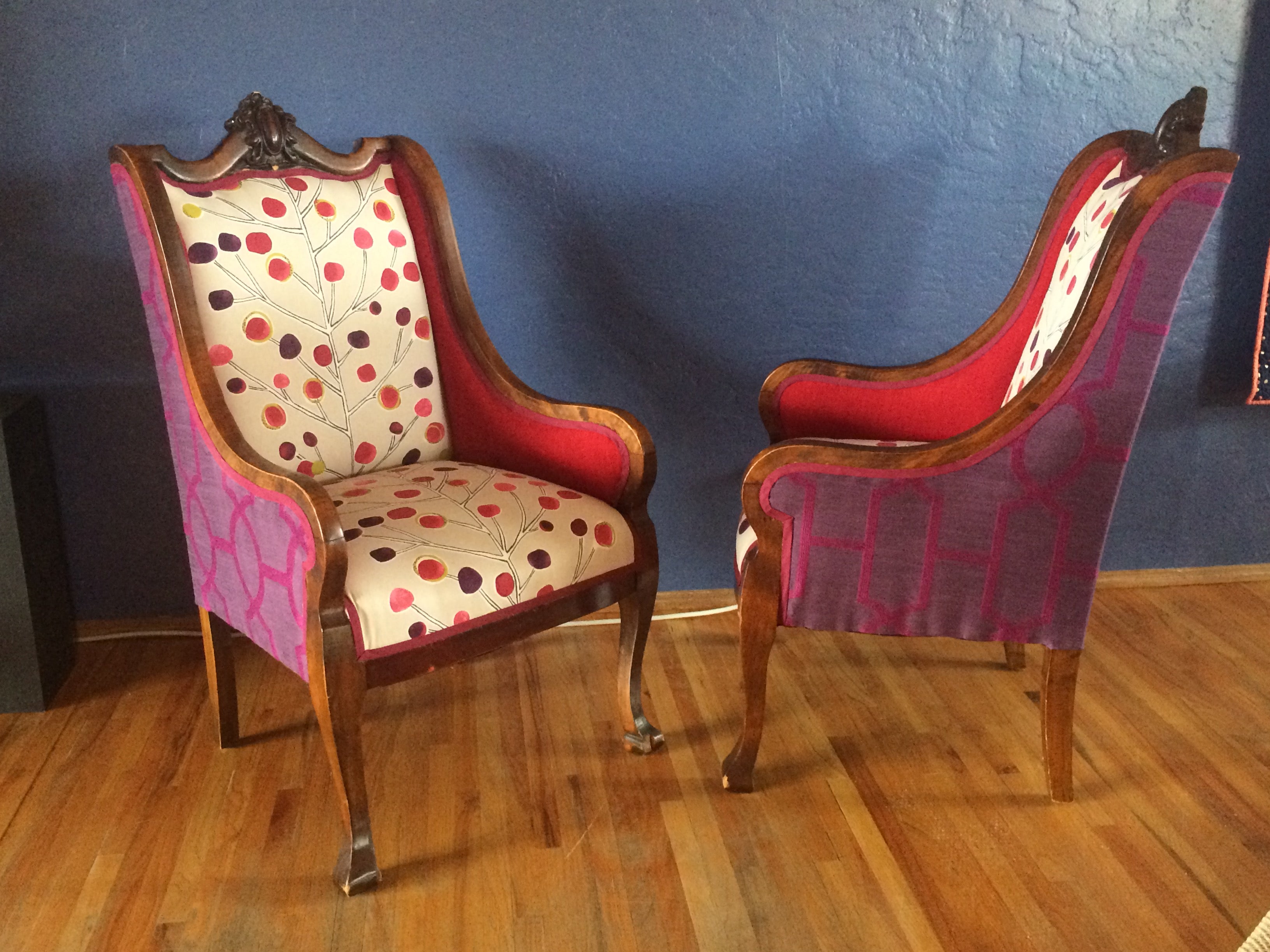 These chairs were upholstered using funky and fun heavyweight quilting fabrics. Purchased at a thrift store, they once sat in the lobby of the famous La Fonda hotel in Santa Fe, NM.