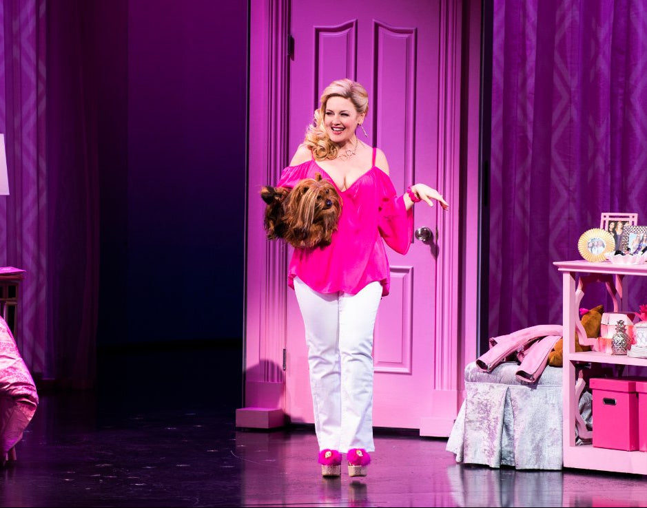 The faux velvet ottoman (hiding under the pile of pink coats) was built and upholstered from scratch for Mean Girls on Broadway. It was later recreated for the First National Tour.