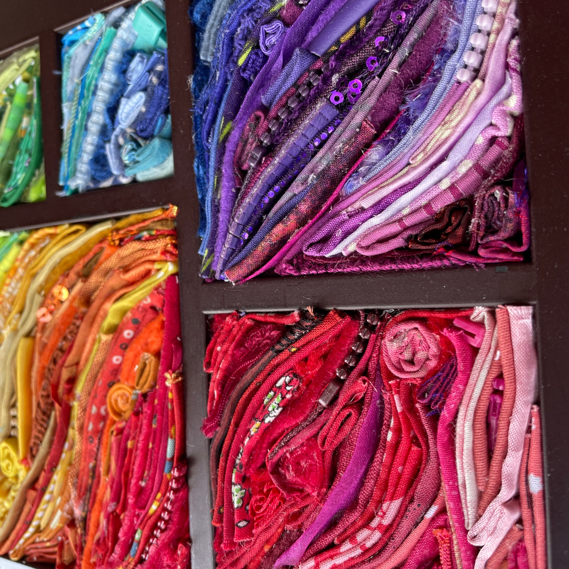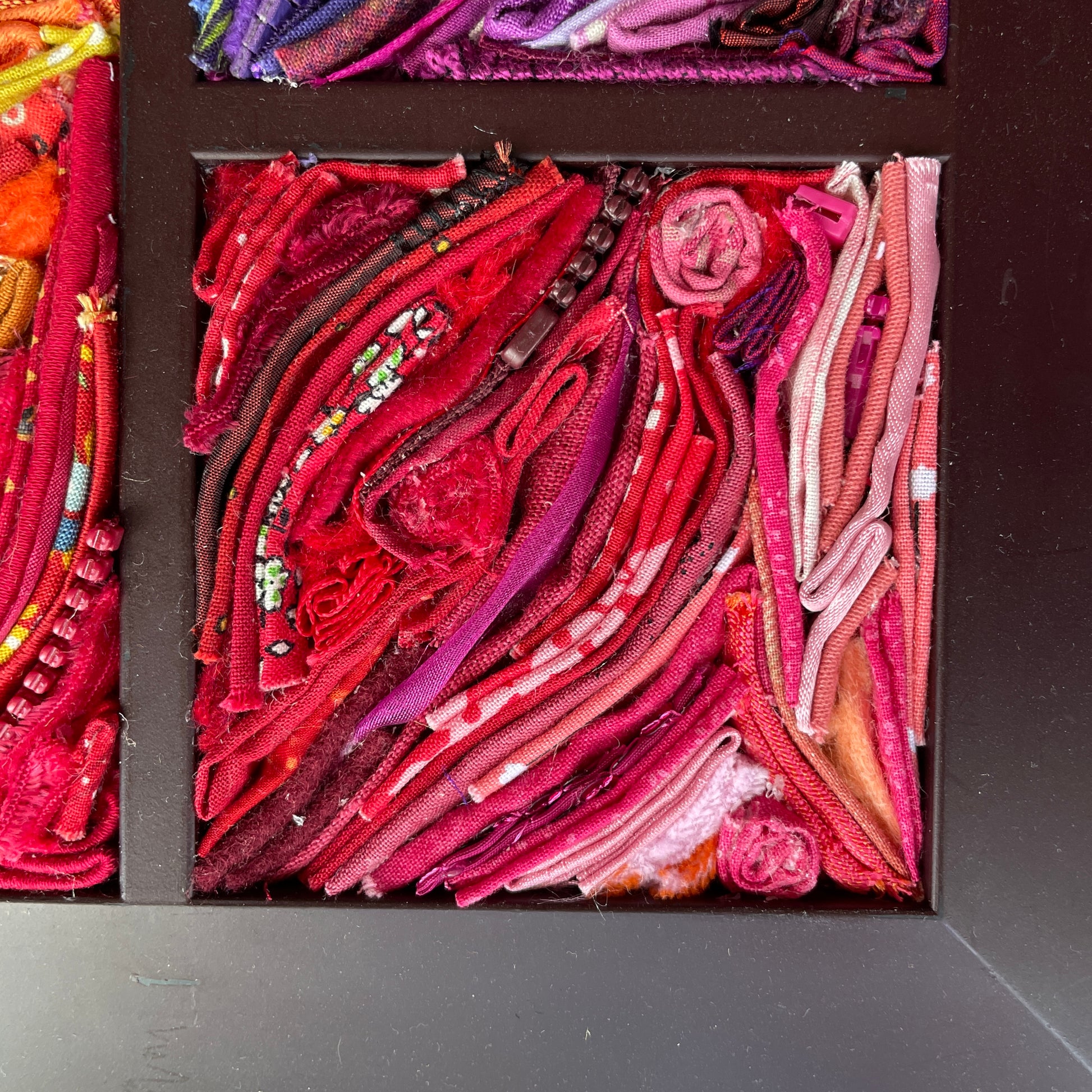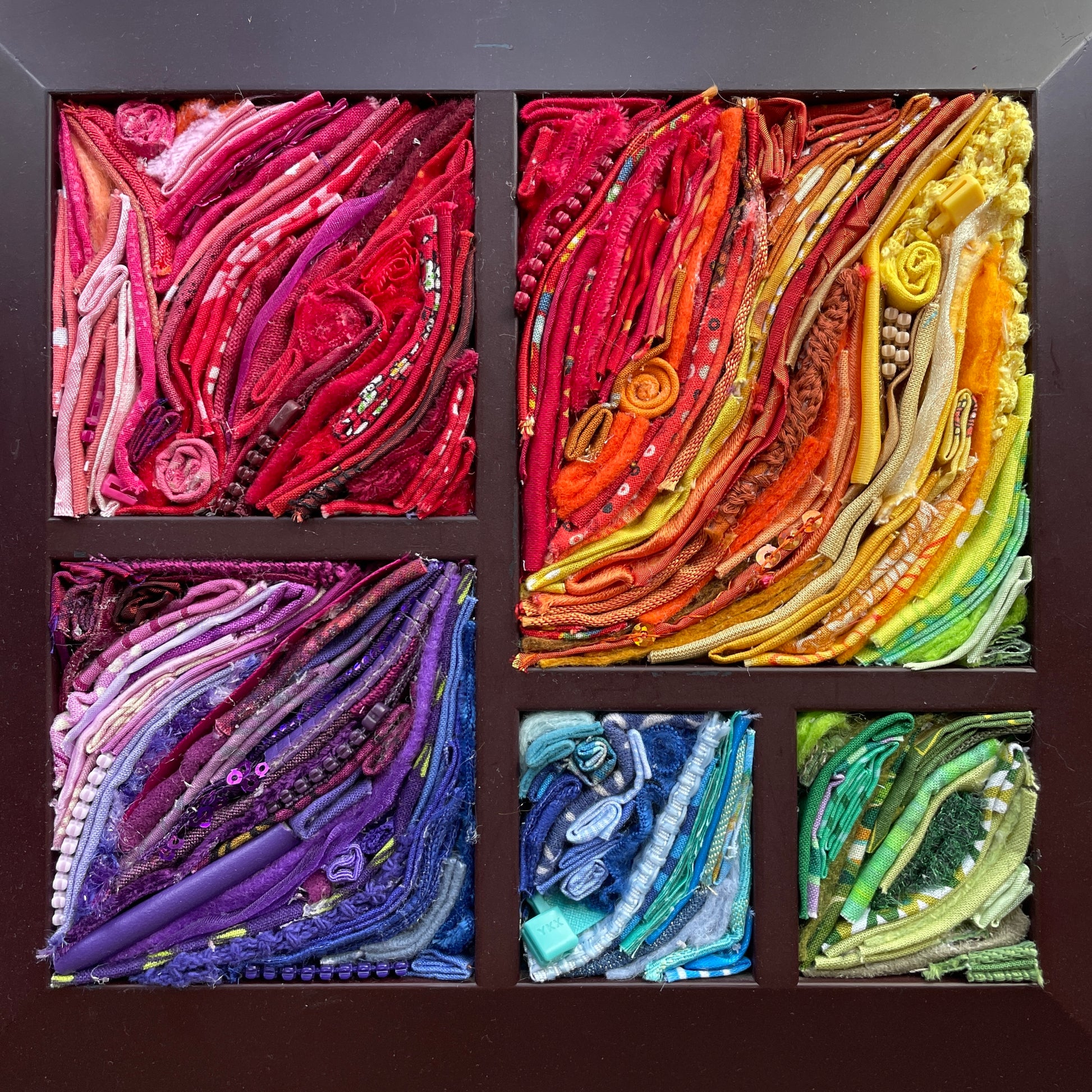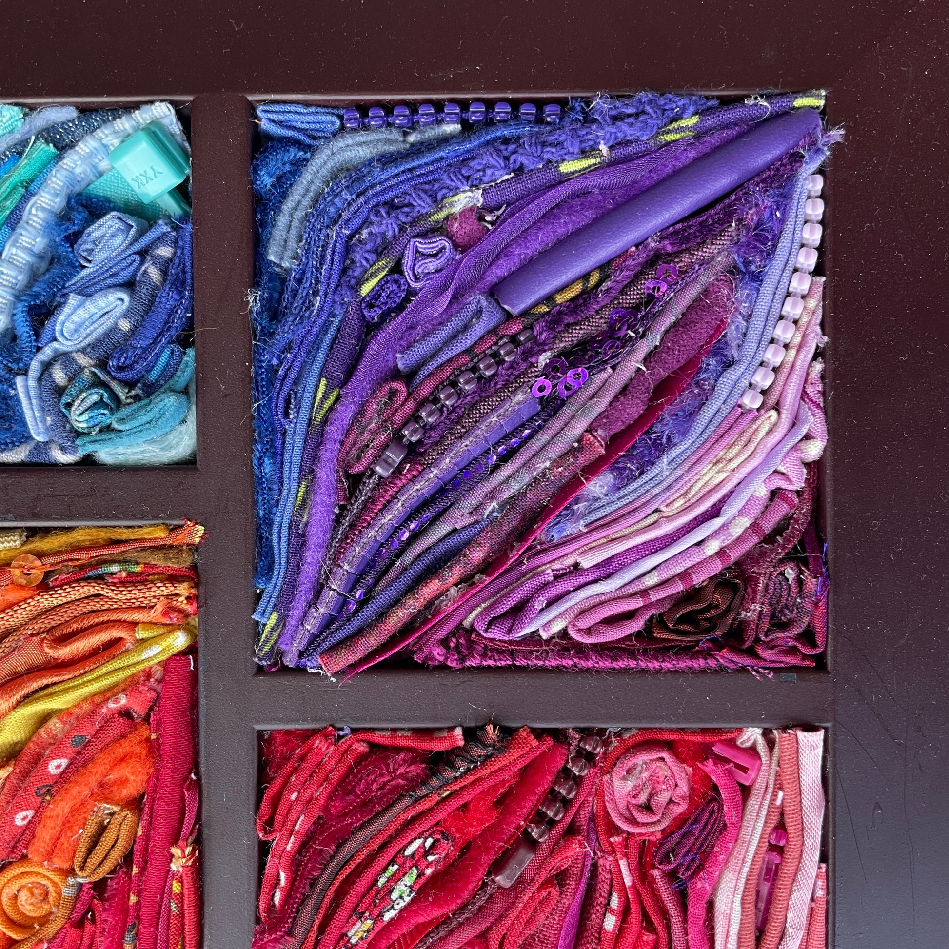 Collage with fabric, fiber goods, zippers, and more in a thrifted frame.