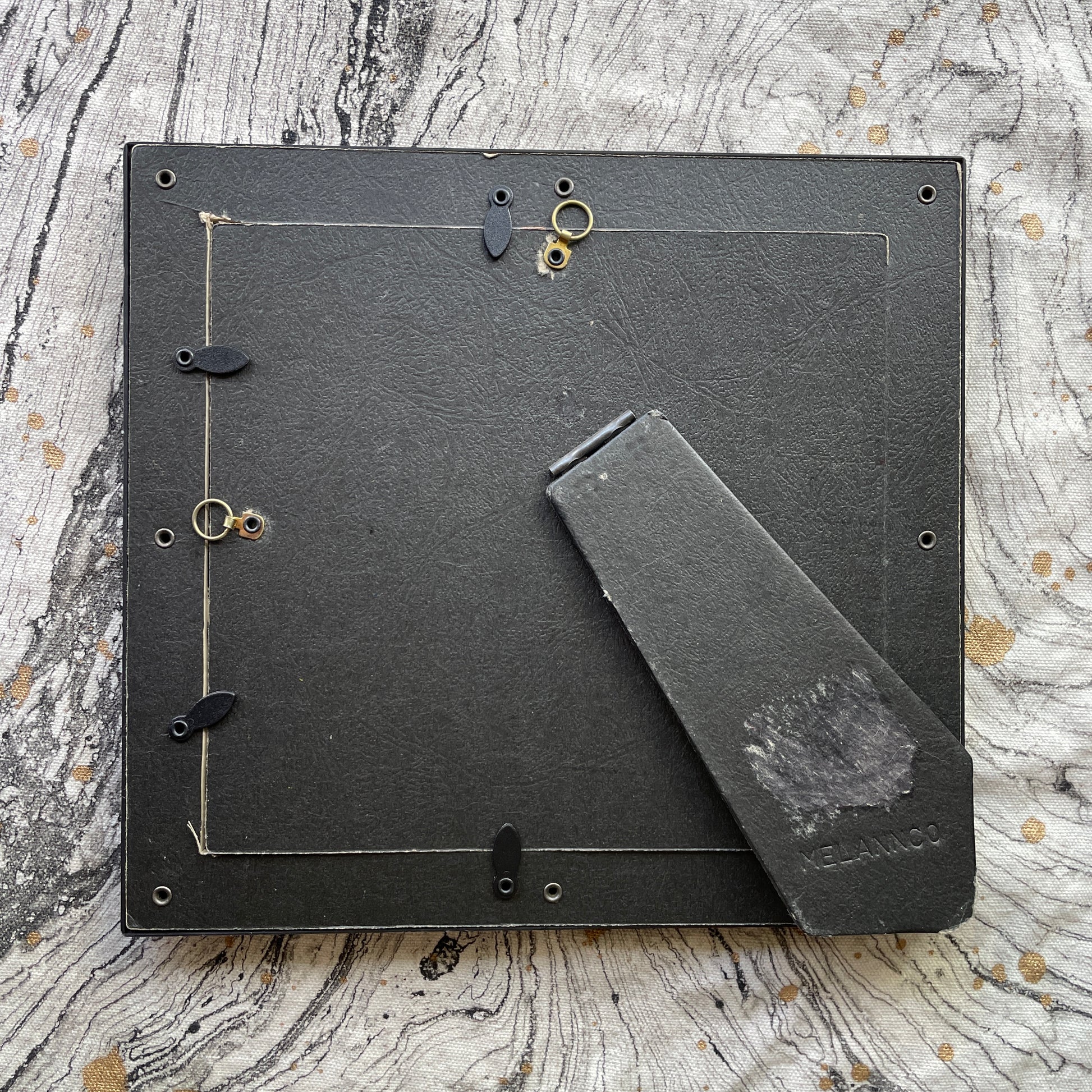 Has hardware to hang or kickstand on back.