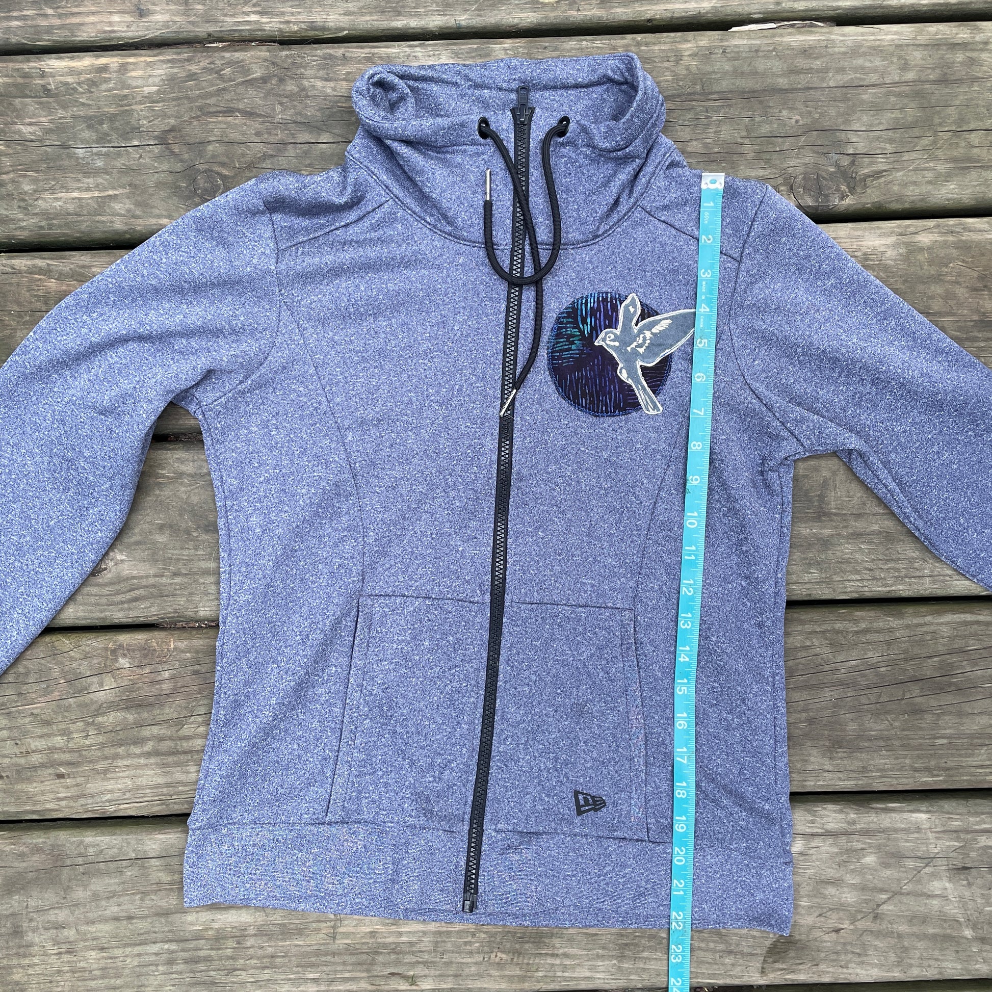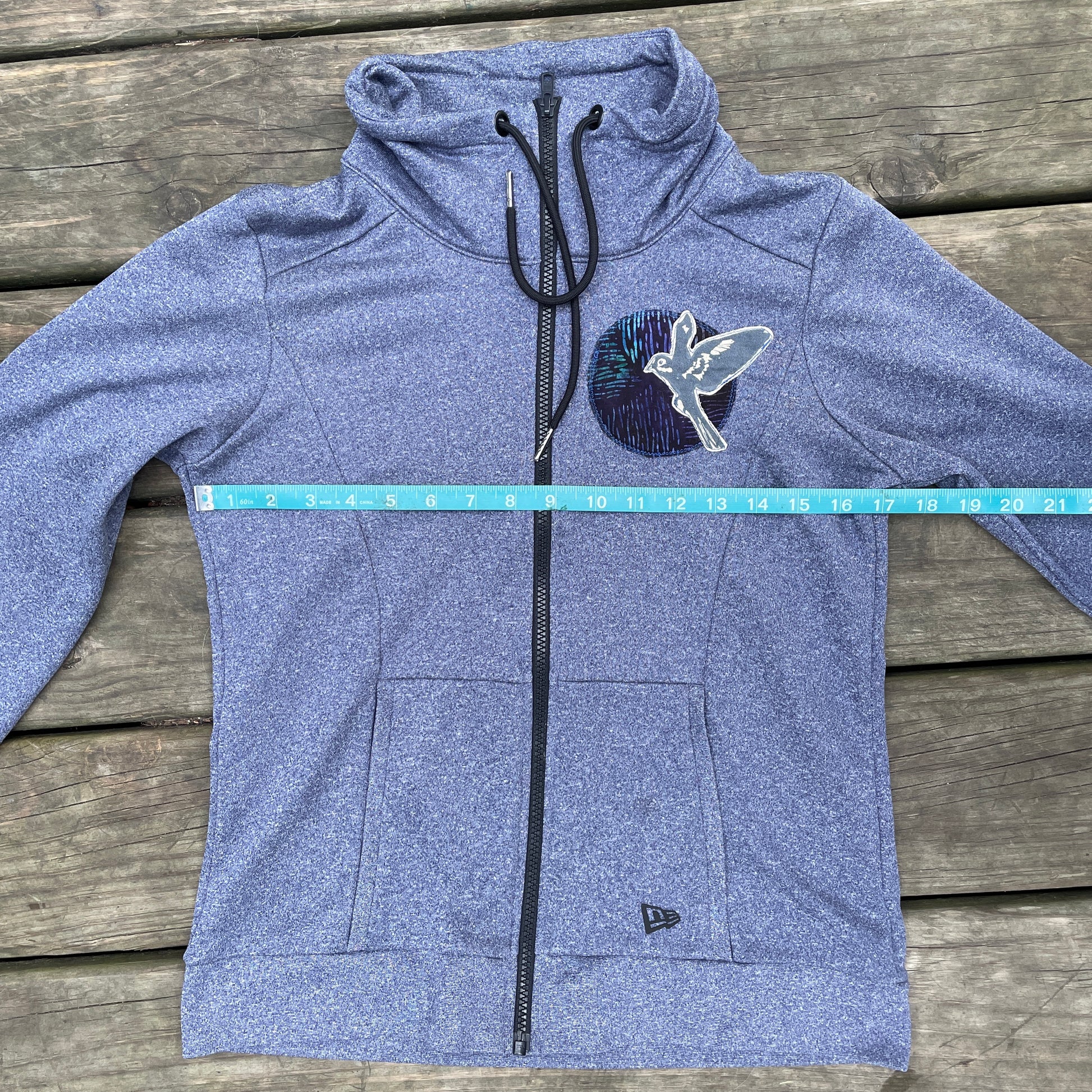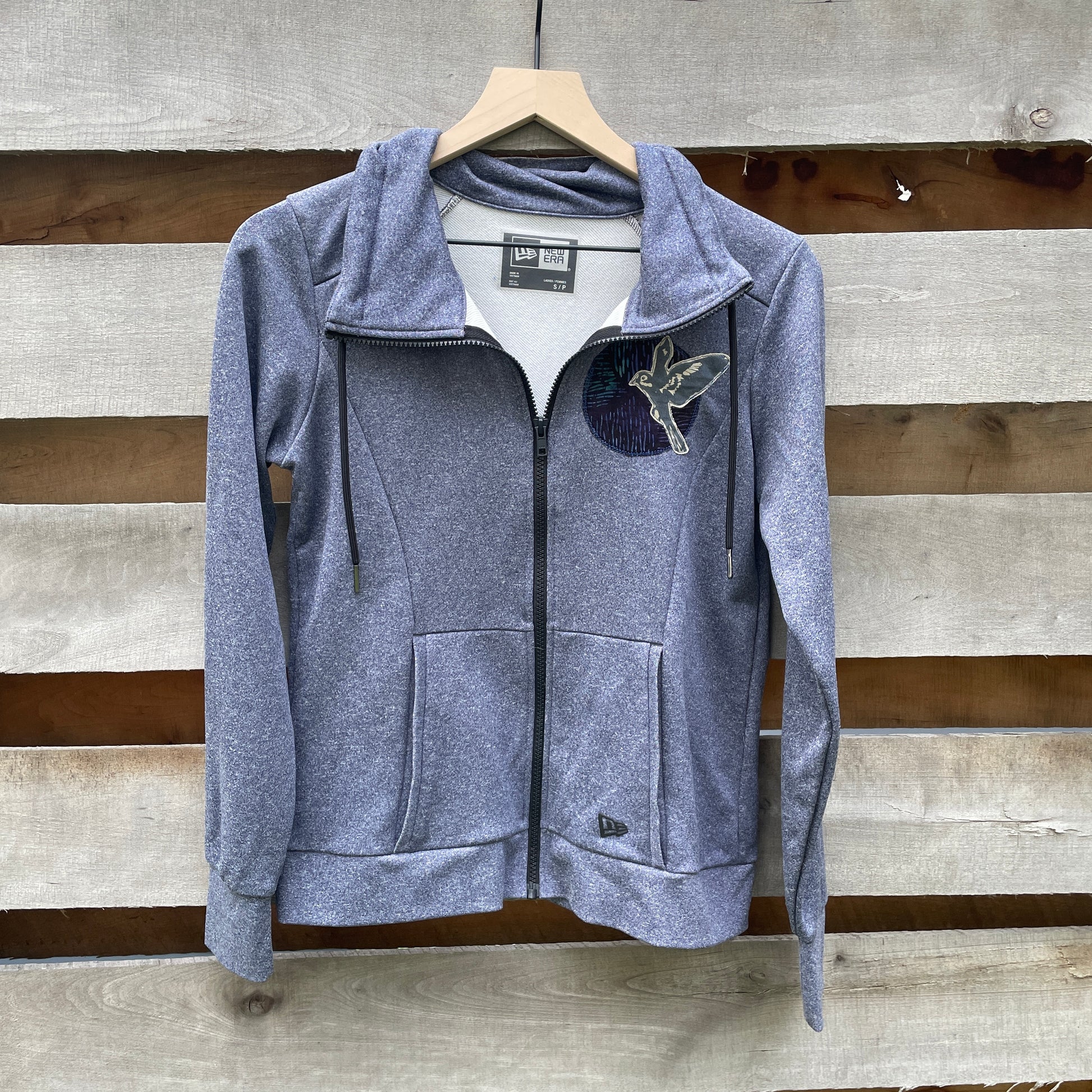 This secondhand hoodie has been elevated with a charming bird appliqué to cover up a company logo.