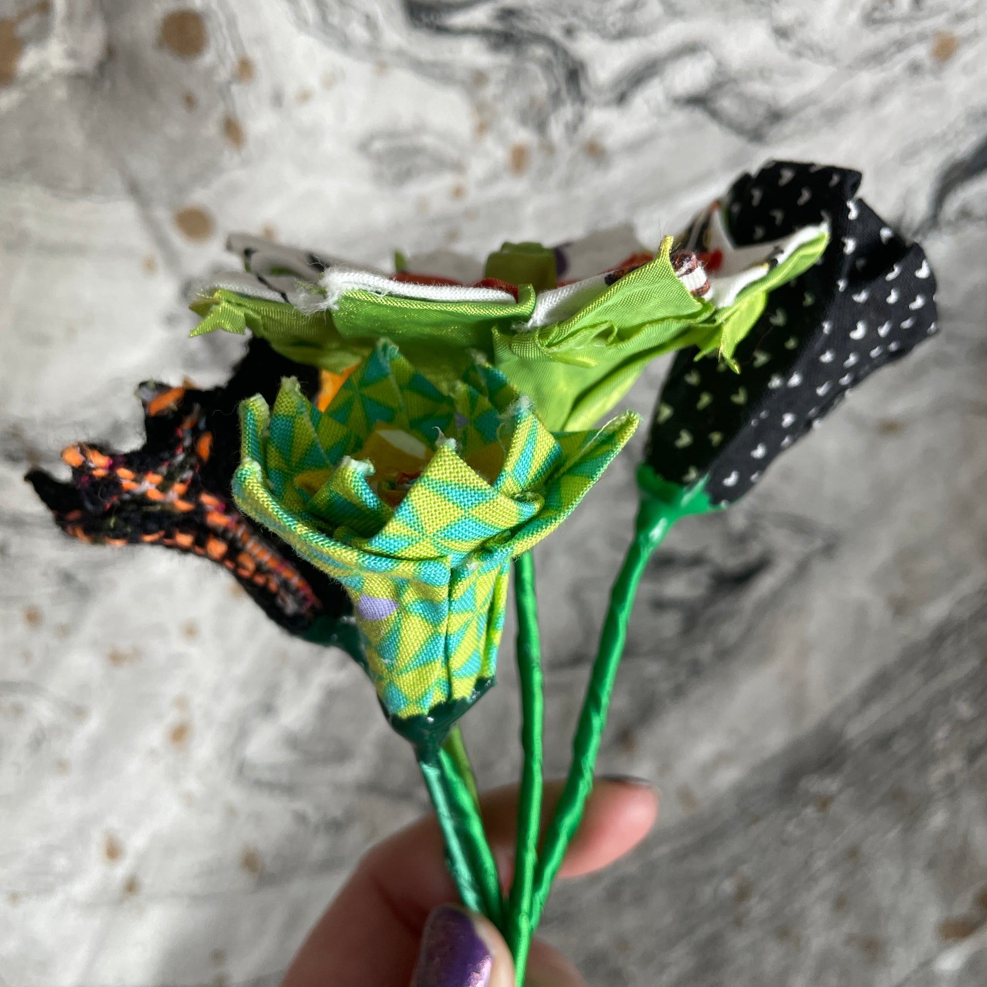 6 fabric flowers in a bundle. The flowers are made with upcycled fabric scraps.