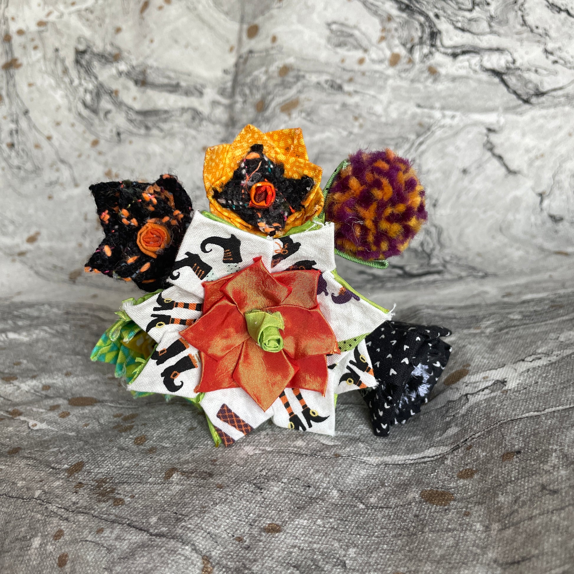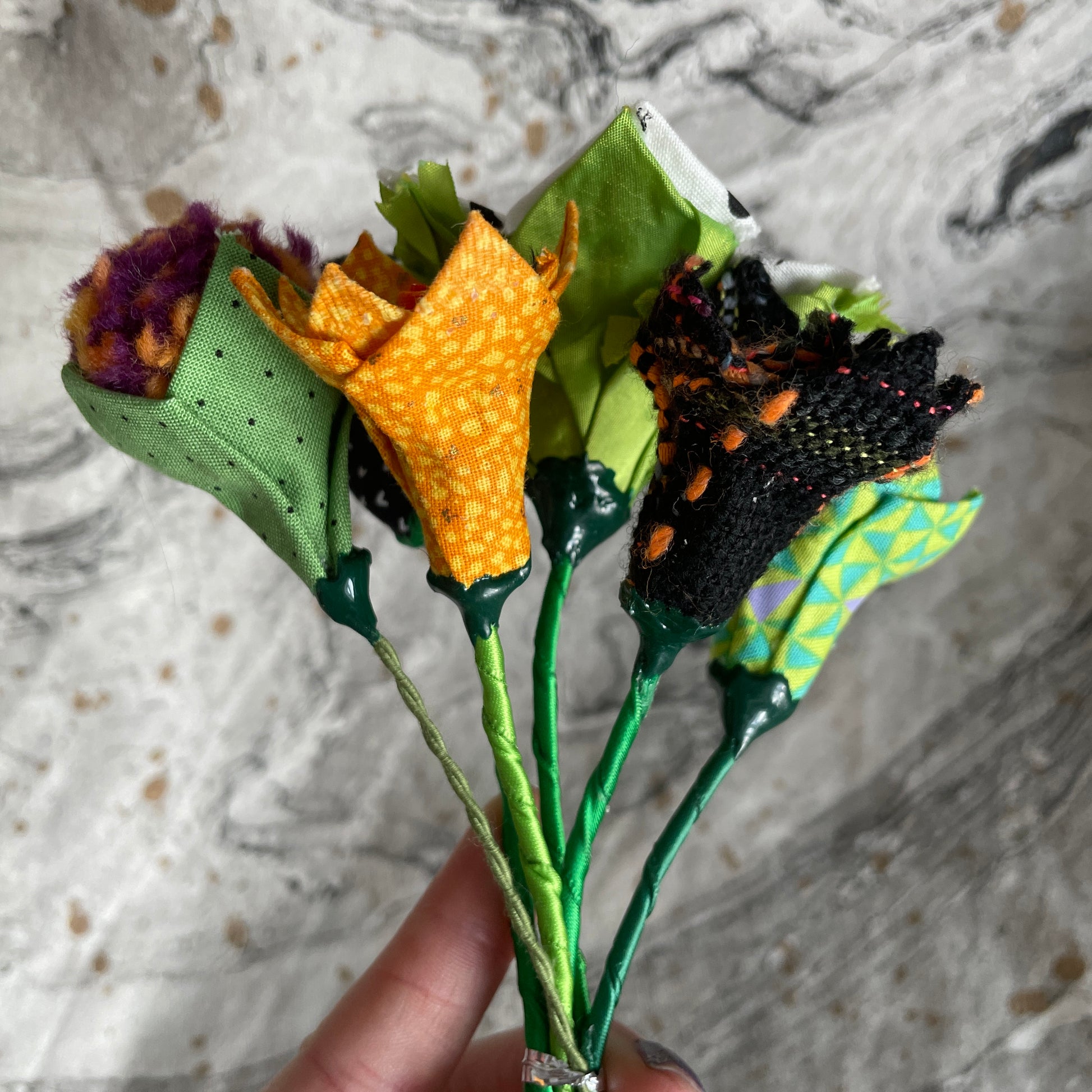 Sources for the materials in this bouquet include: quilting scraps, tablecloths, yarn scrap, and upholstery swatches.
