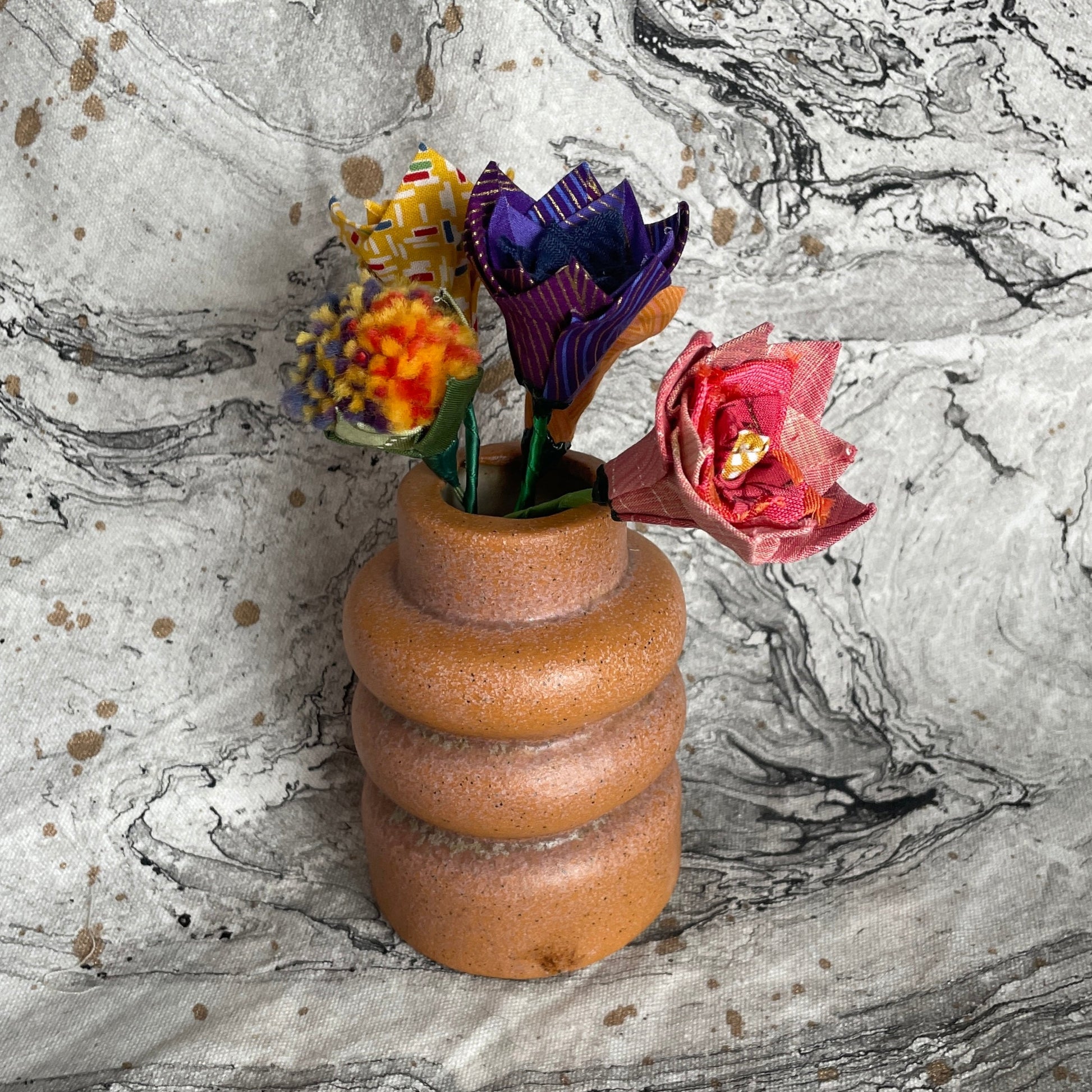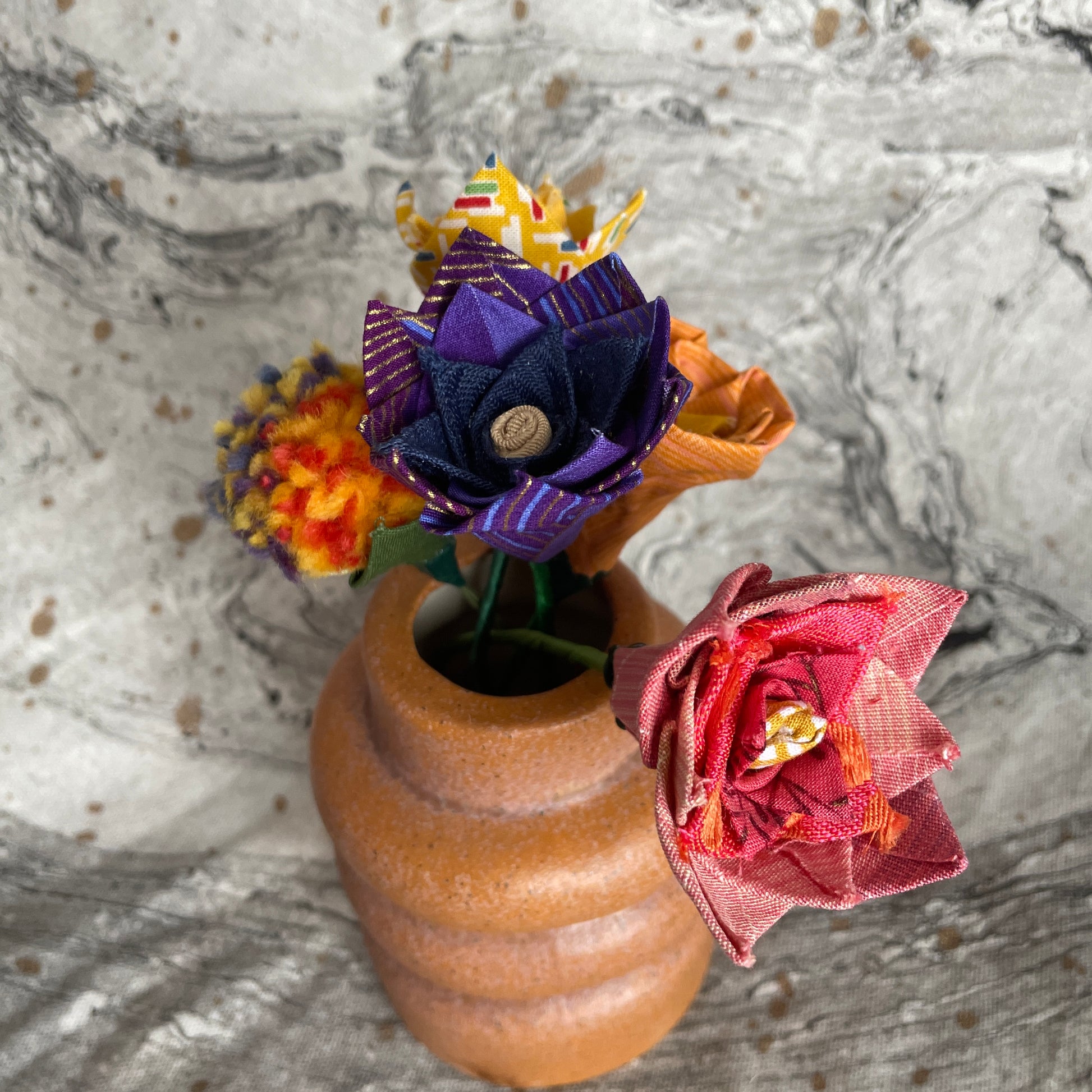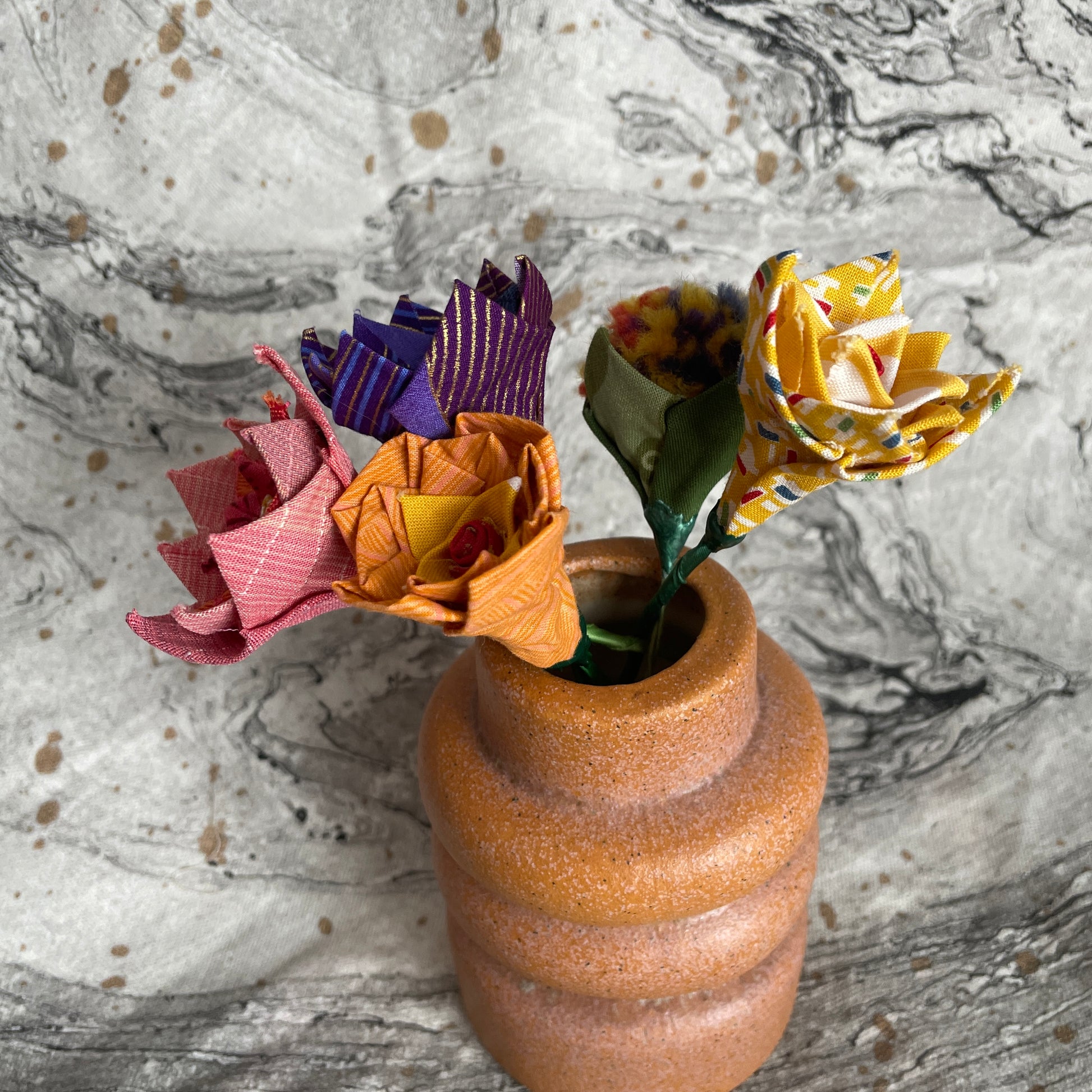 5 fabric flowers in a unique ceramic vase. The flowers are made with upcycled fabric scraps.