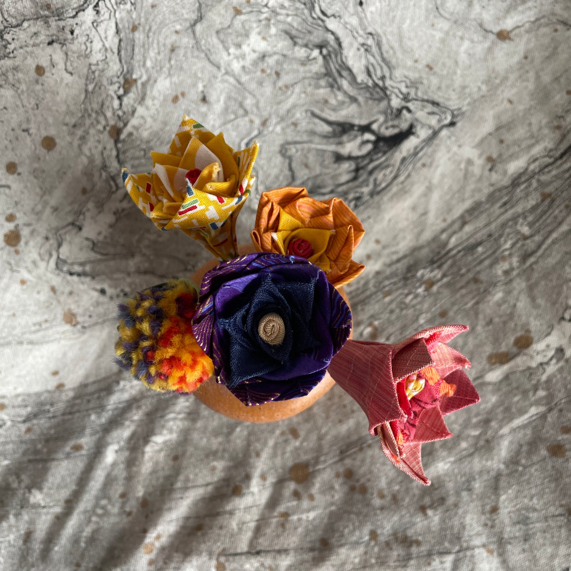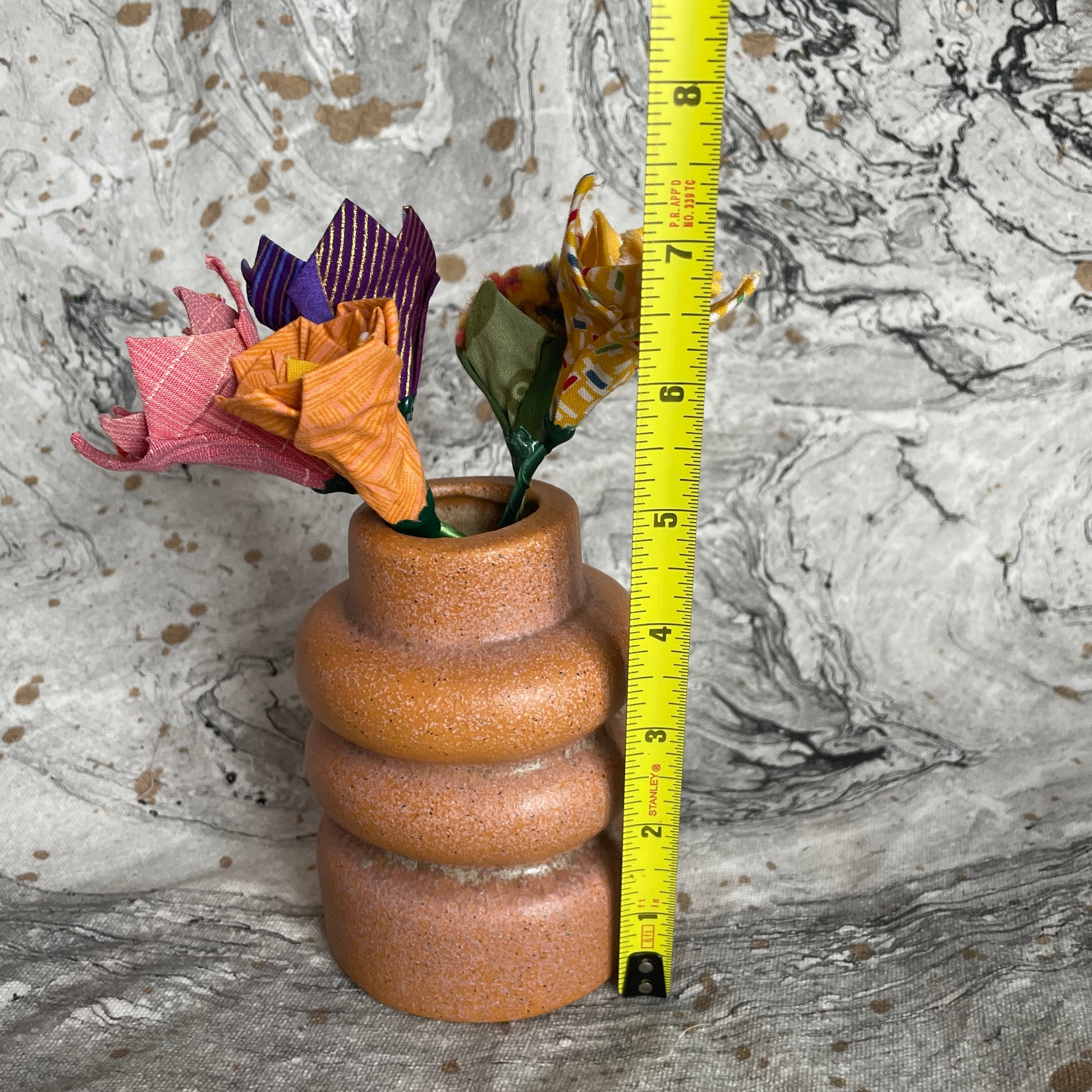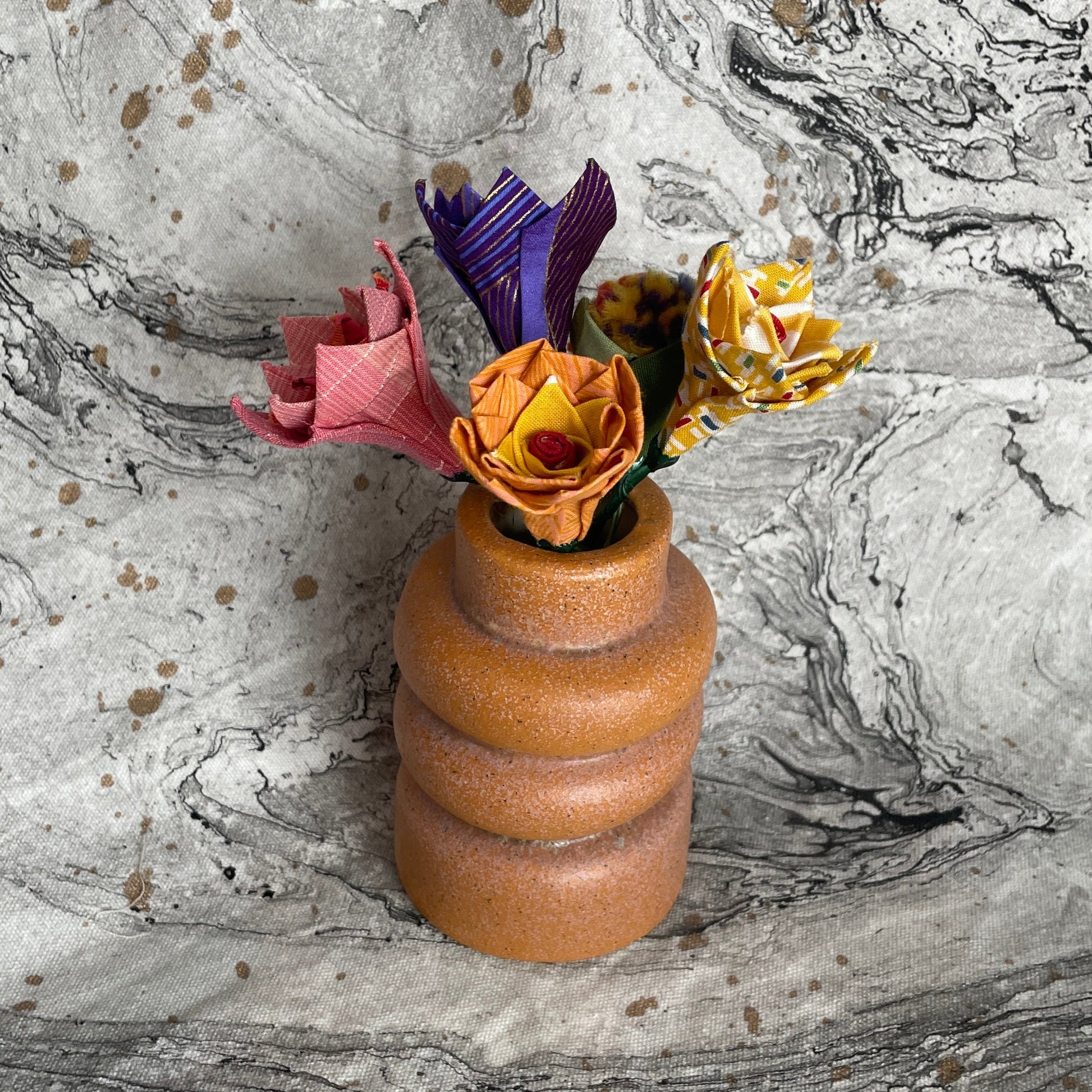 5 fabric flowers in a unique ceramic vase. The flowers are made with upcycled fabric scraps.