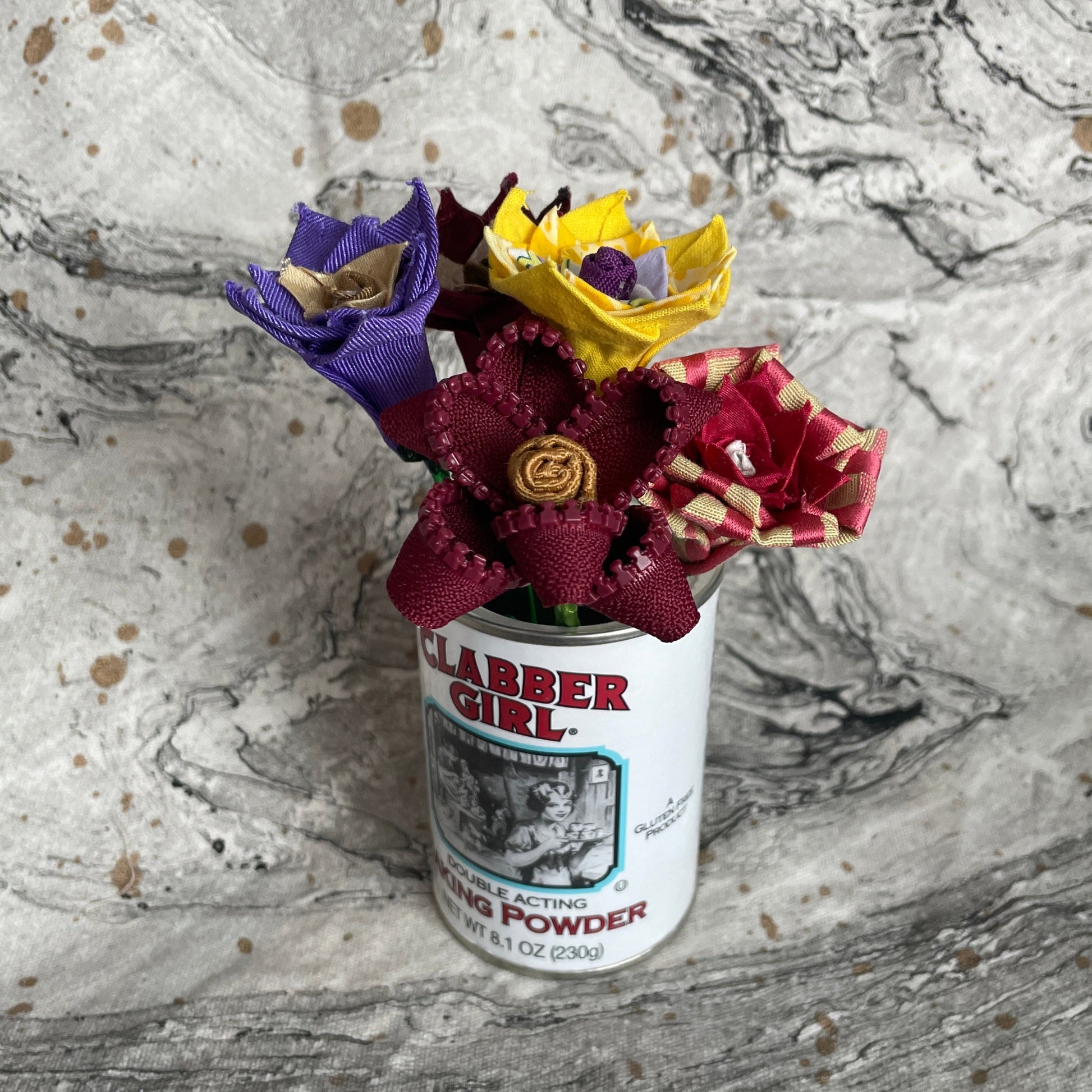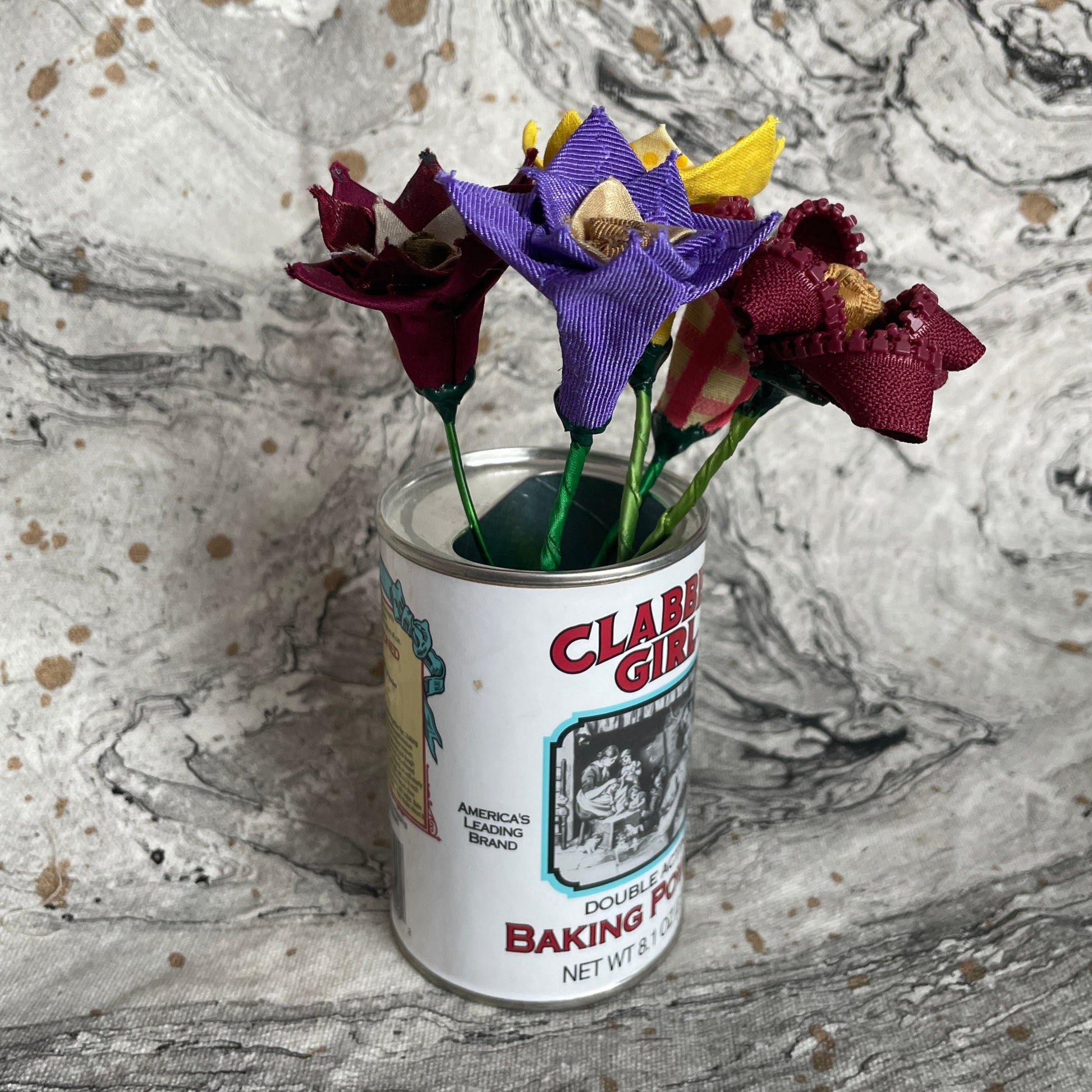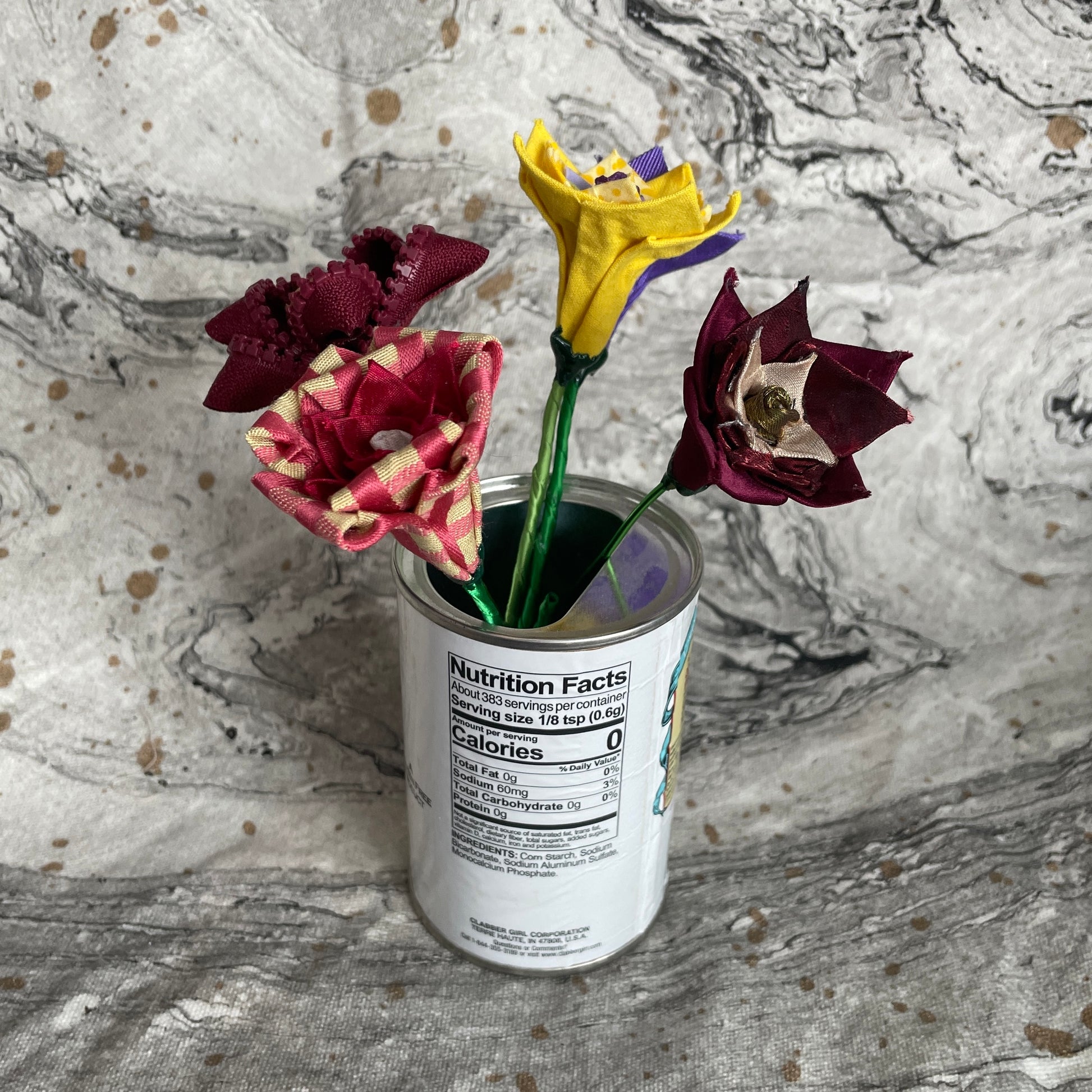 5 fabric flowers in a baking powder can. The flowers are made with upcycled fabric scraps.