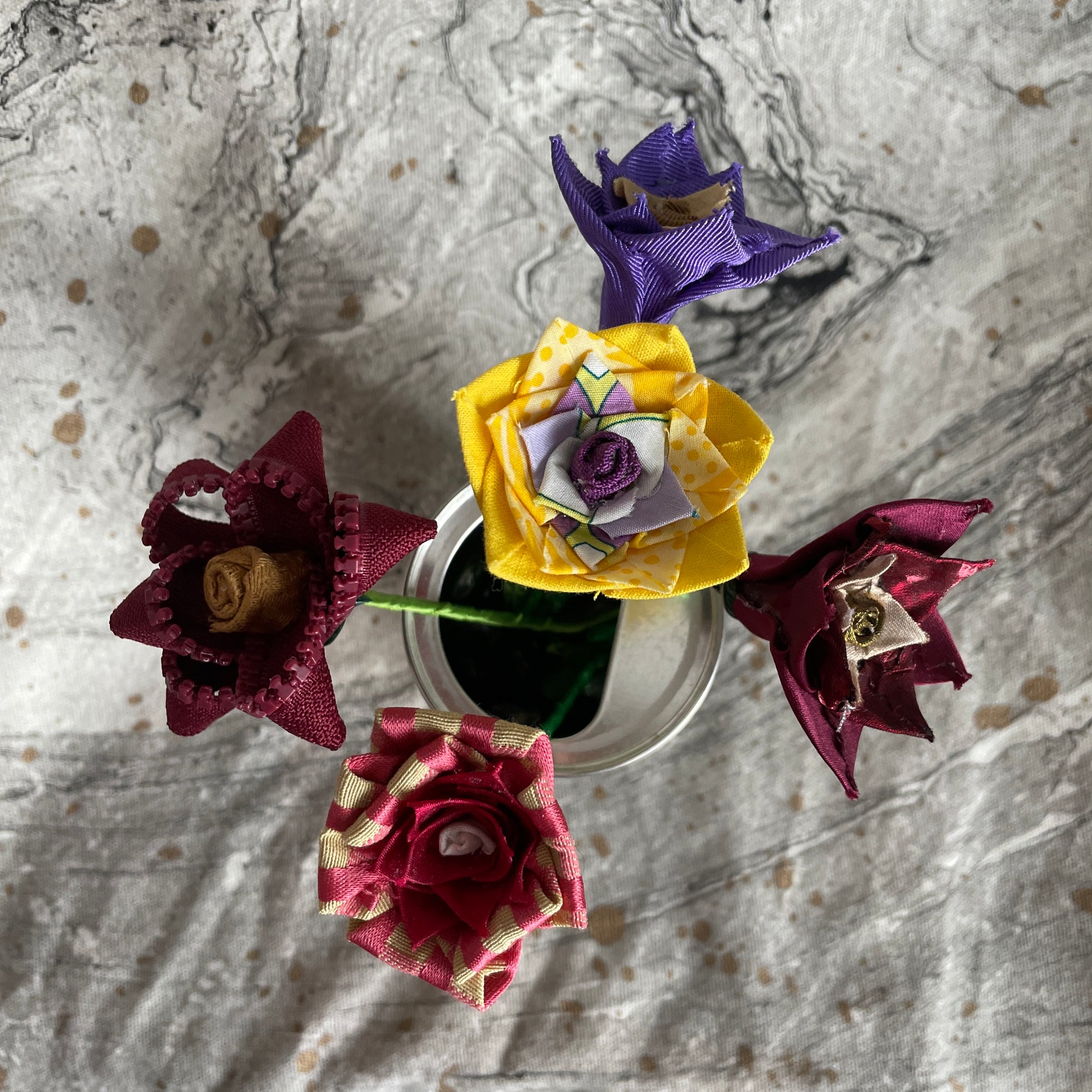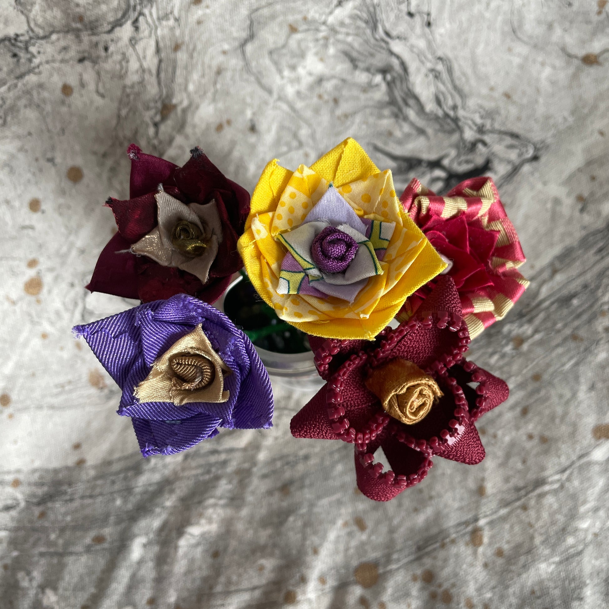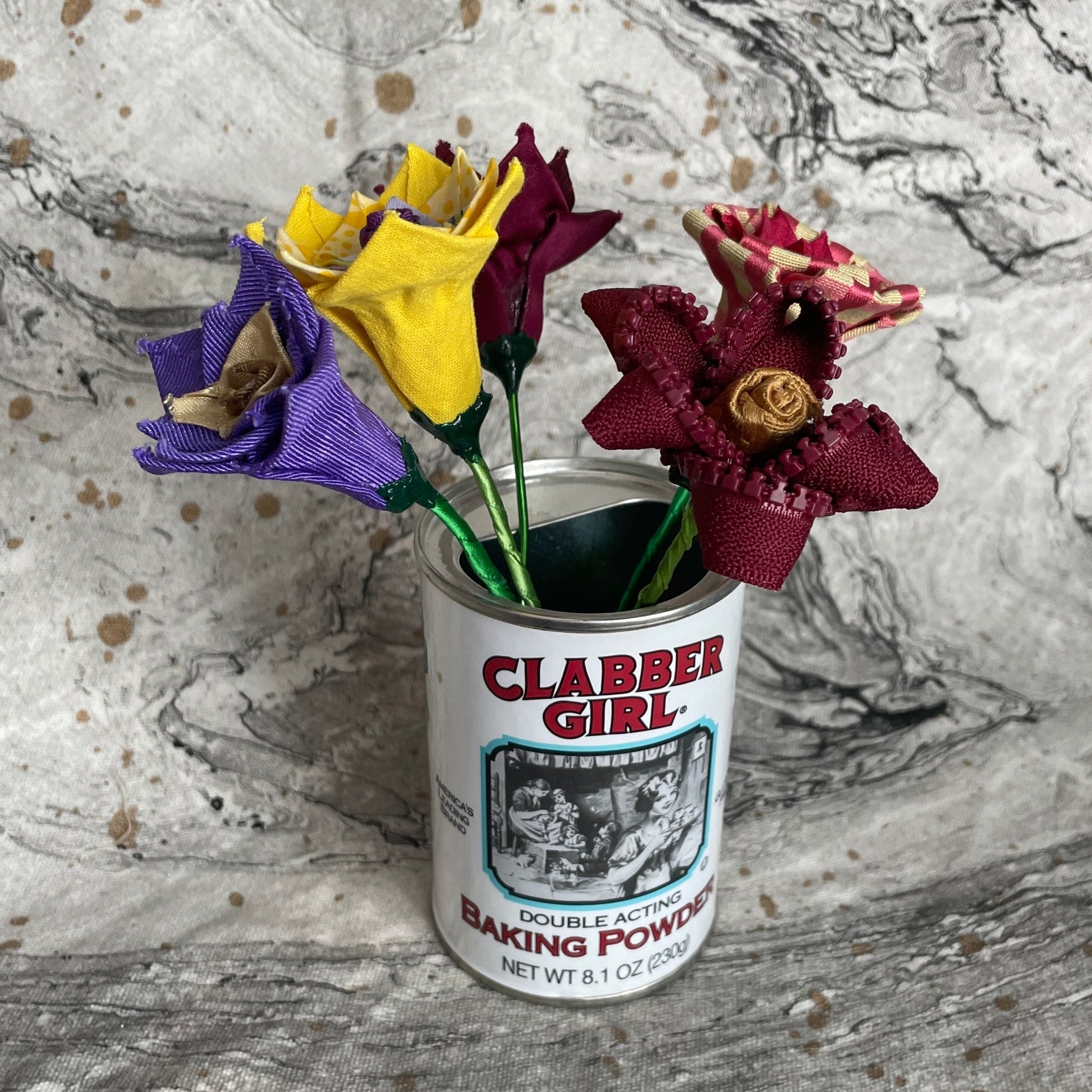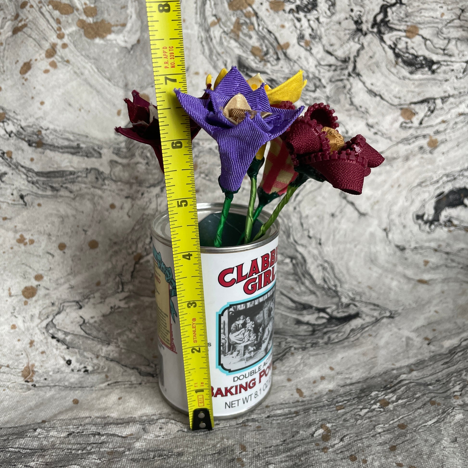 5 fabric flowers in a baking powder can. The flowers are made with upcycled fabric scraps.