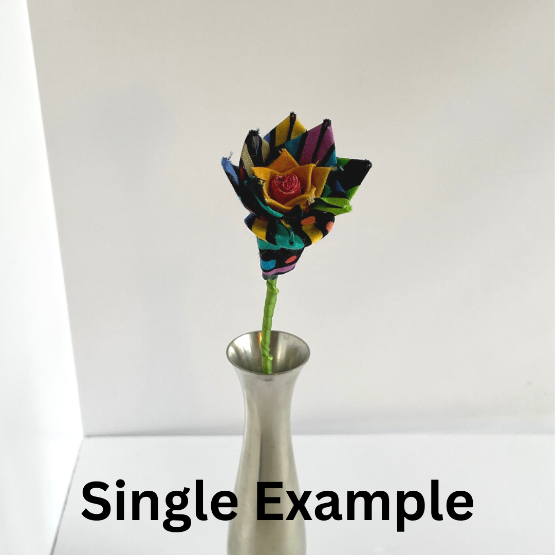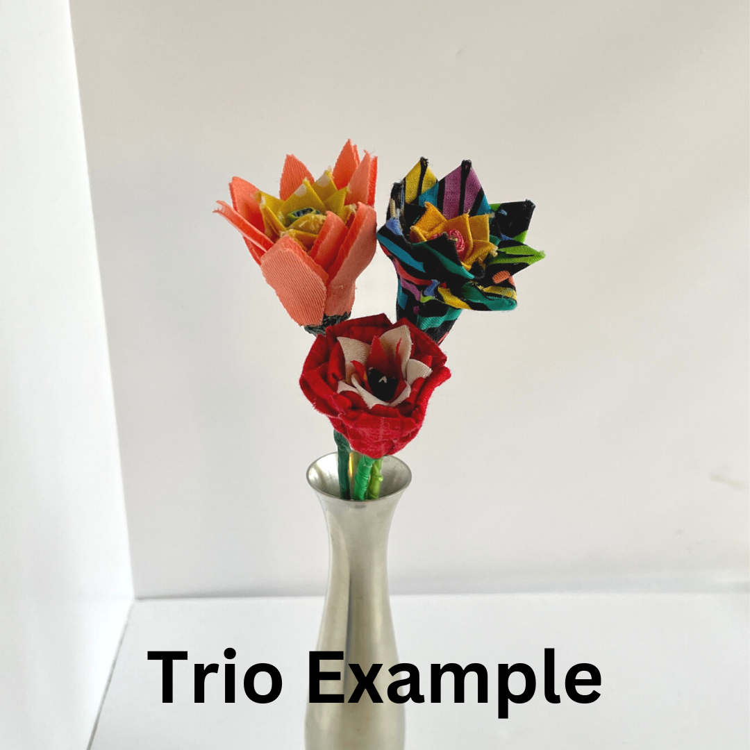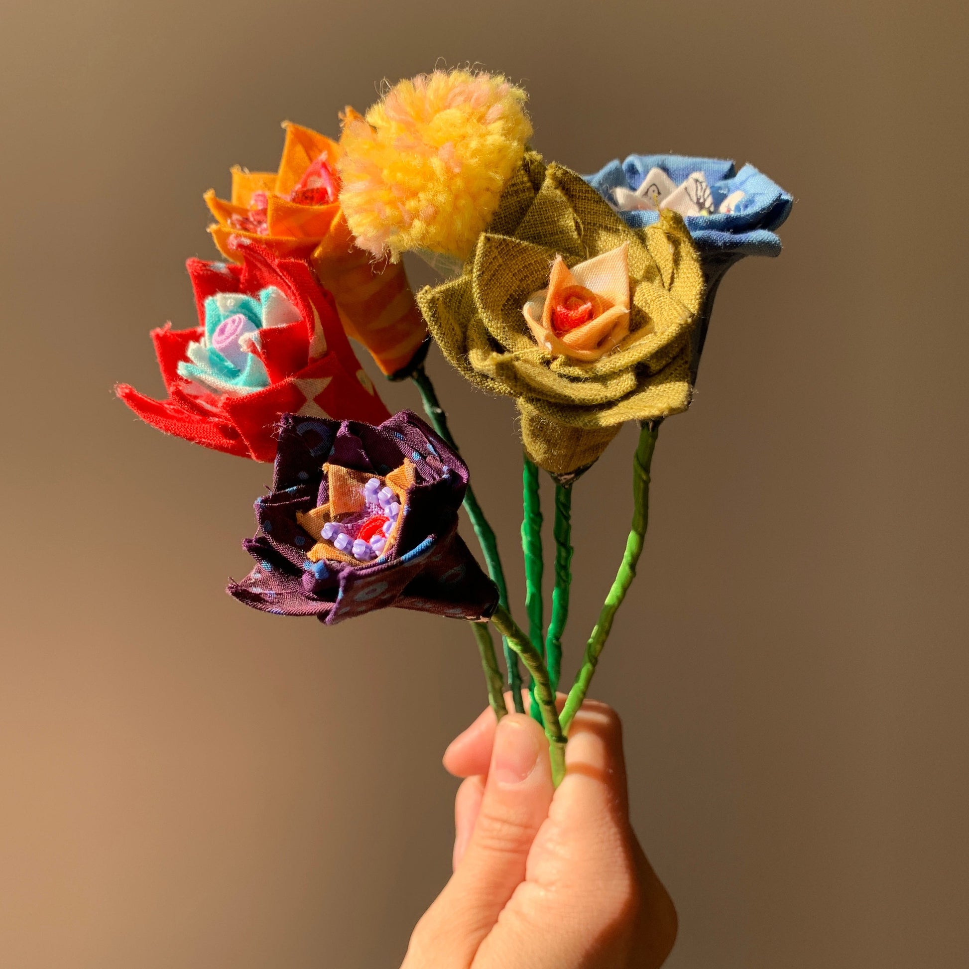 Fabric flowers made with upcycled fabric scraps. The fabric comes from other makers, local companies, thrift stores, clothing, upholstery, & other secondhand sources!