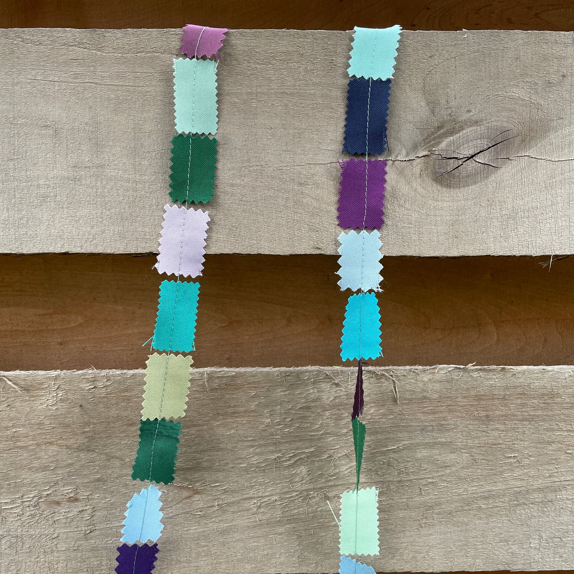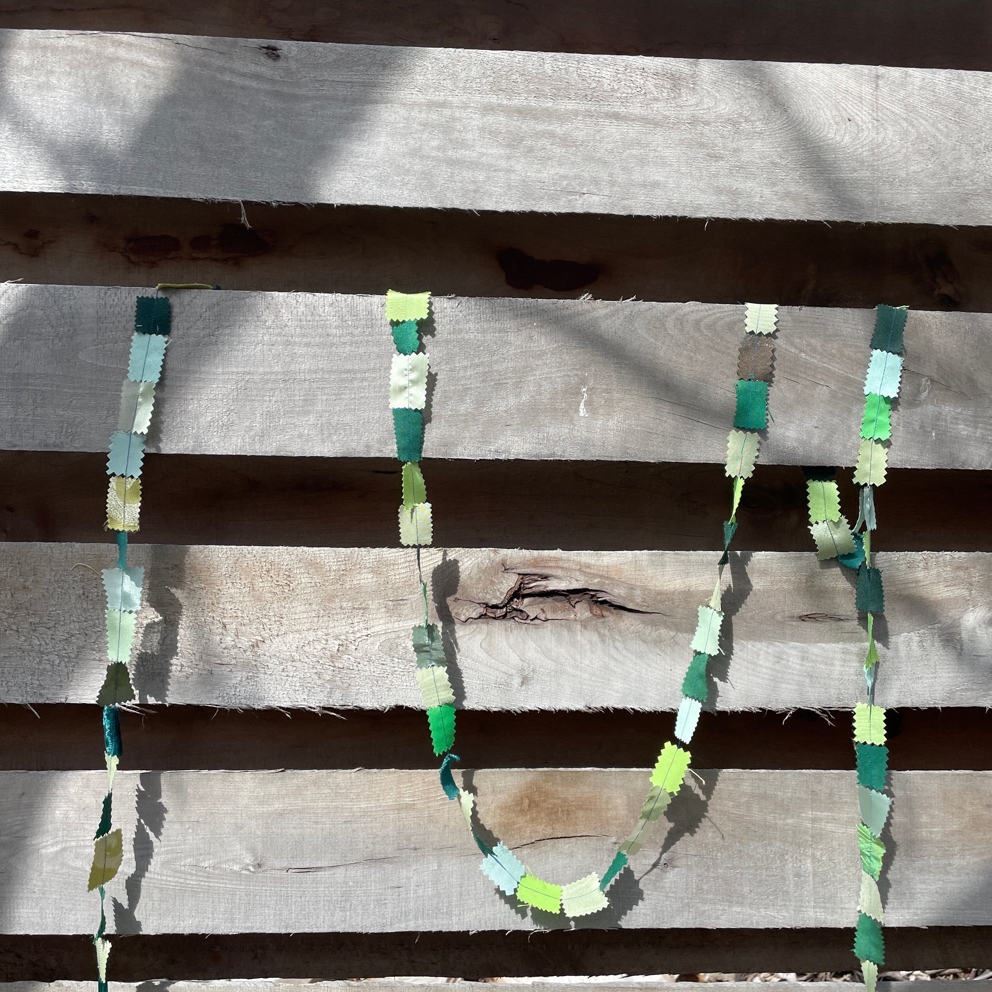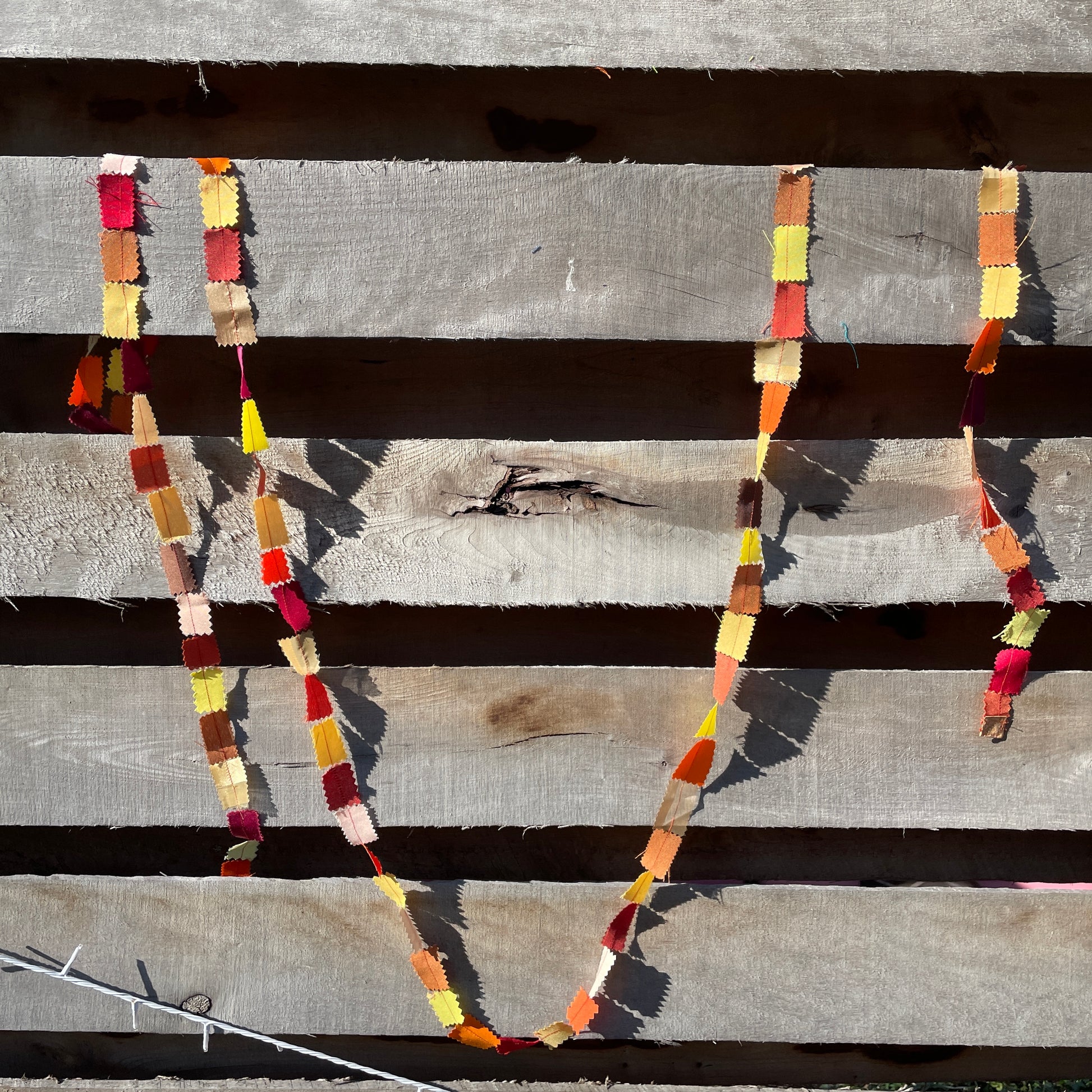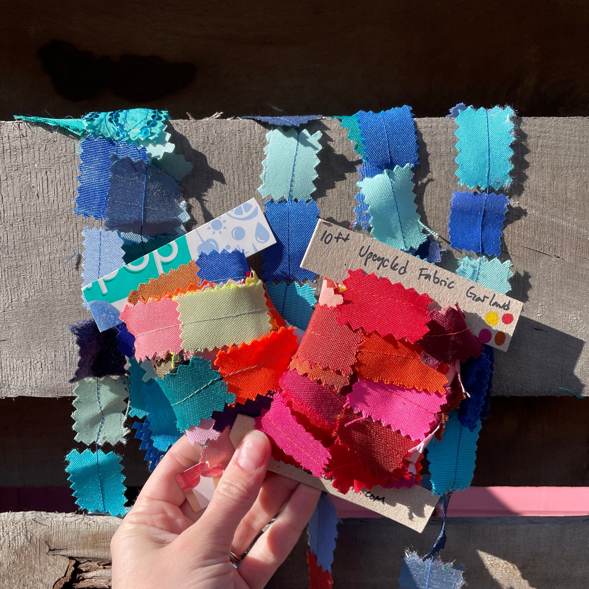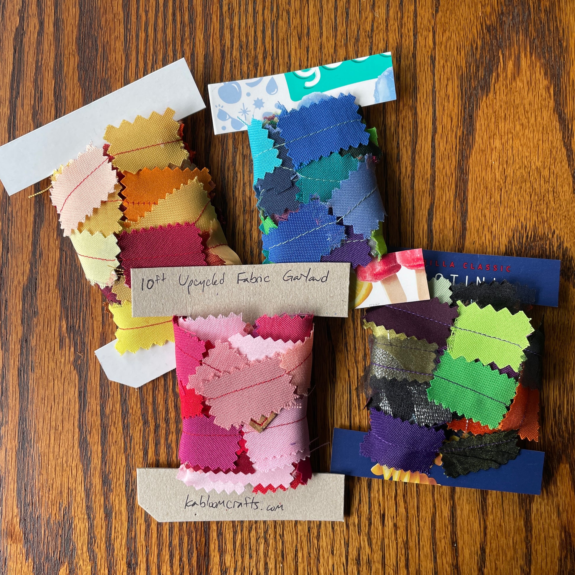 Fabric was removed from sample swatch cards, diverted from the landfill to my fabric stash! Each garland will be one-of-a-kind, in the designated color family.