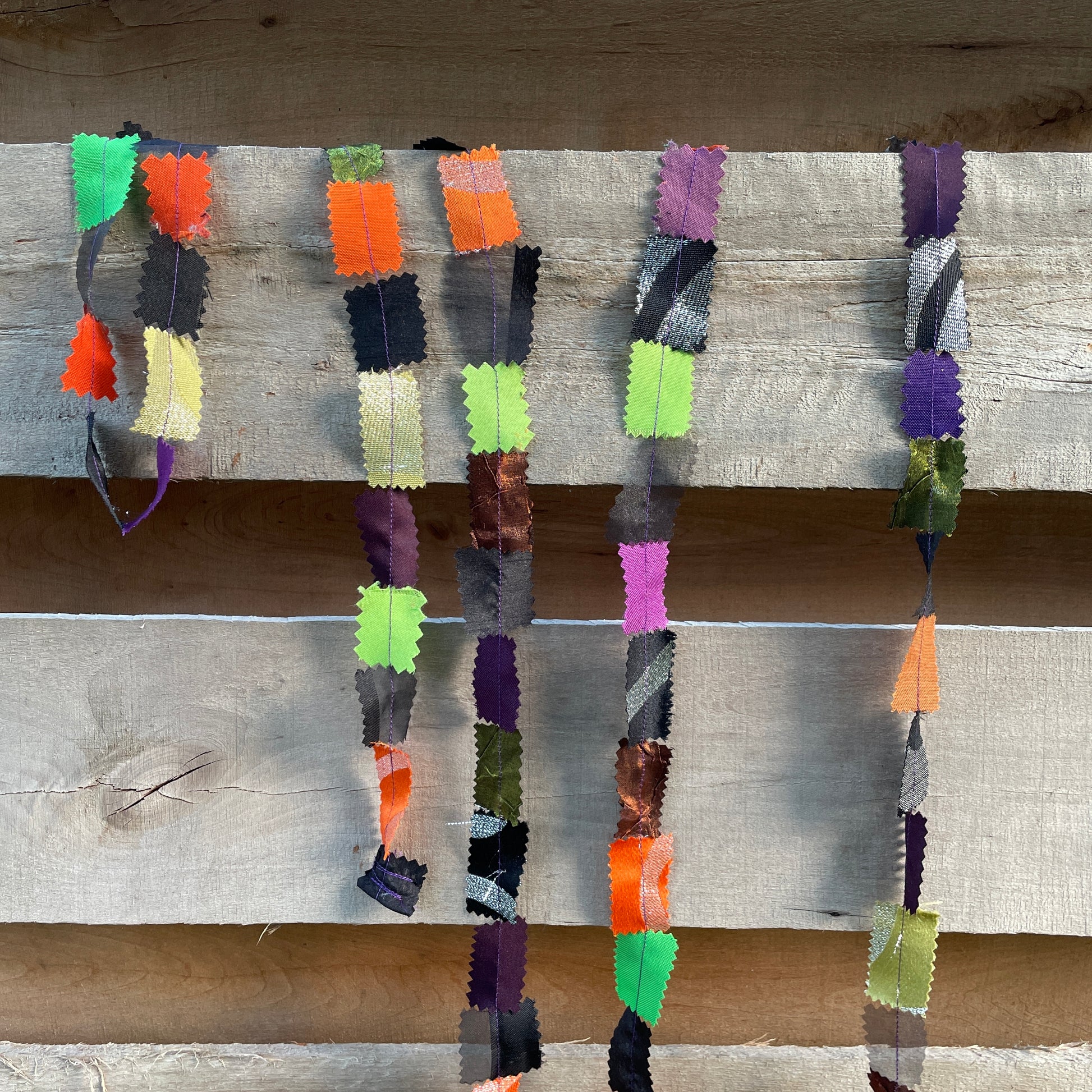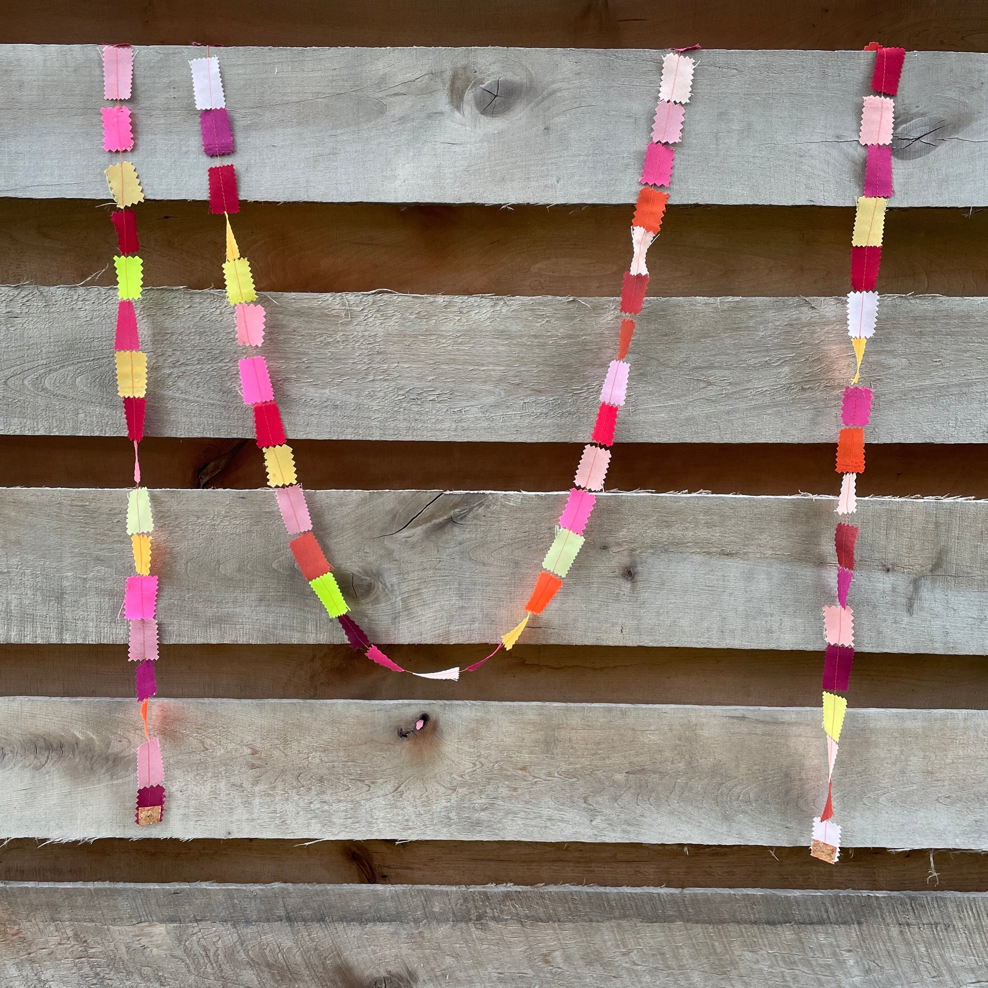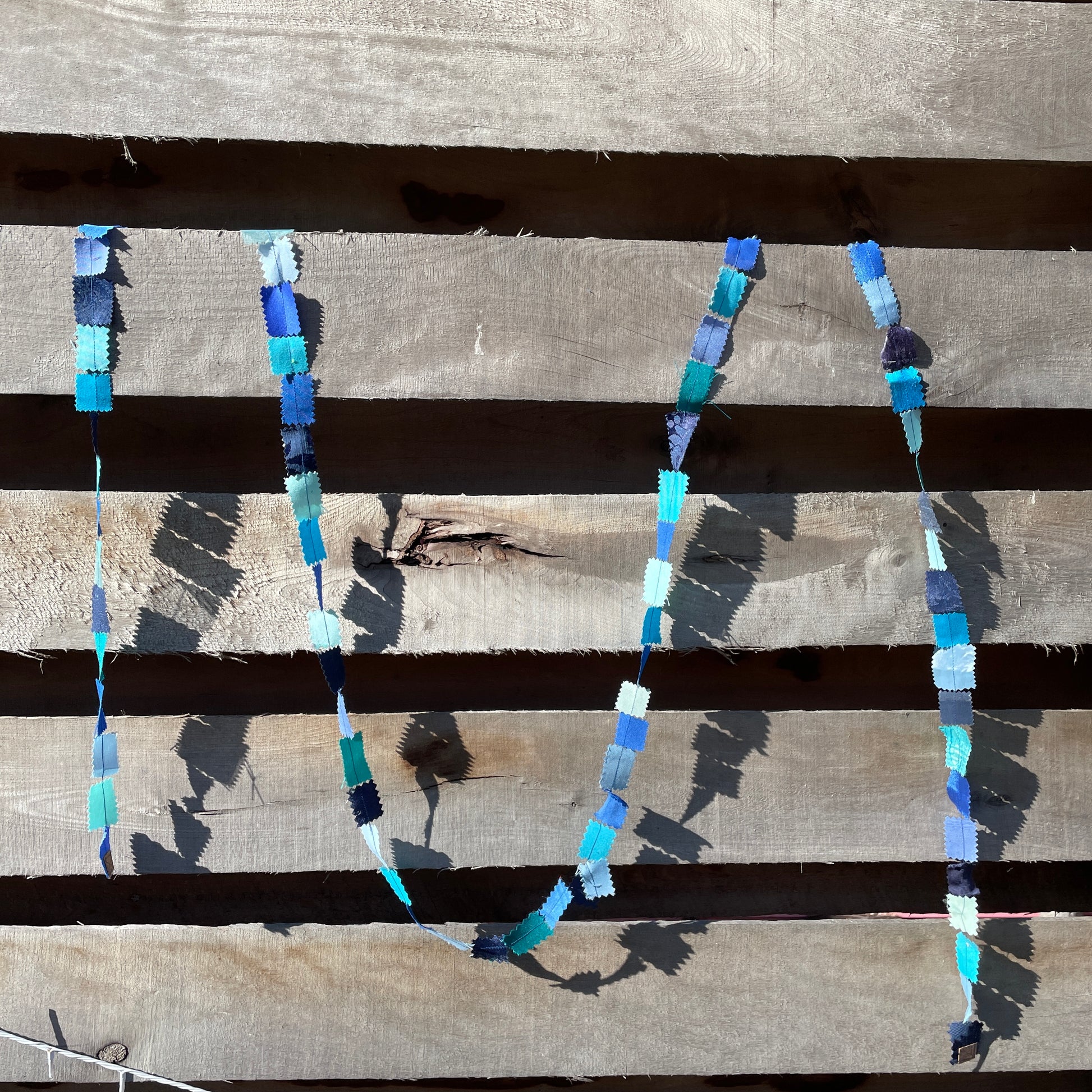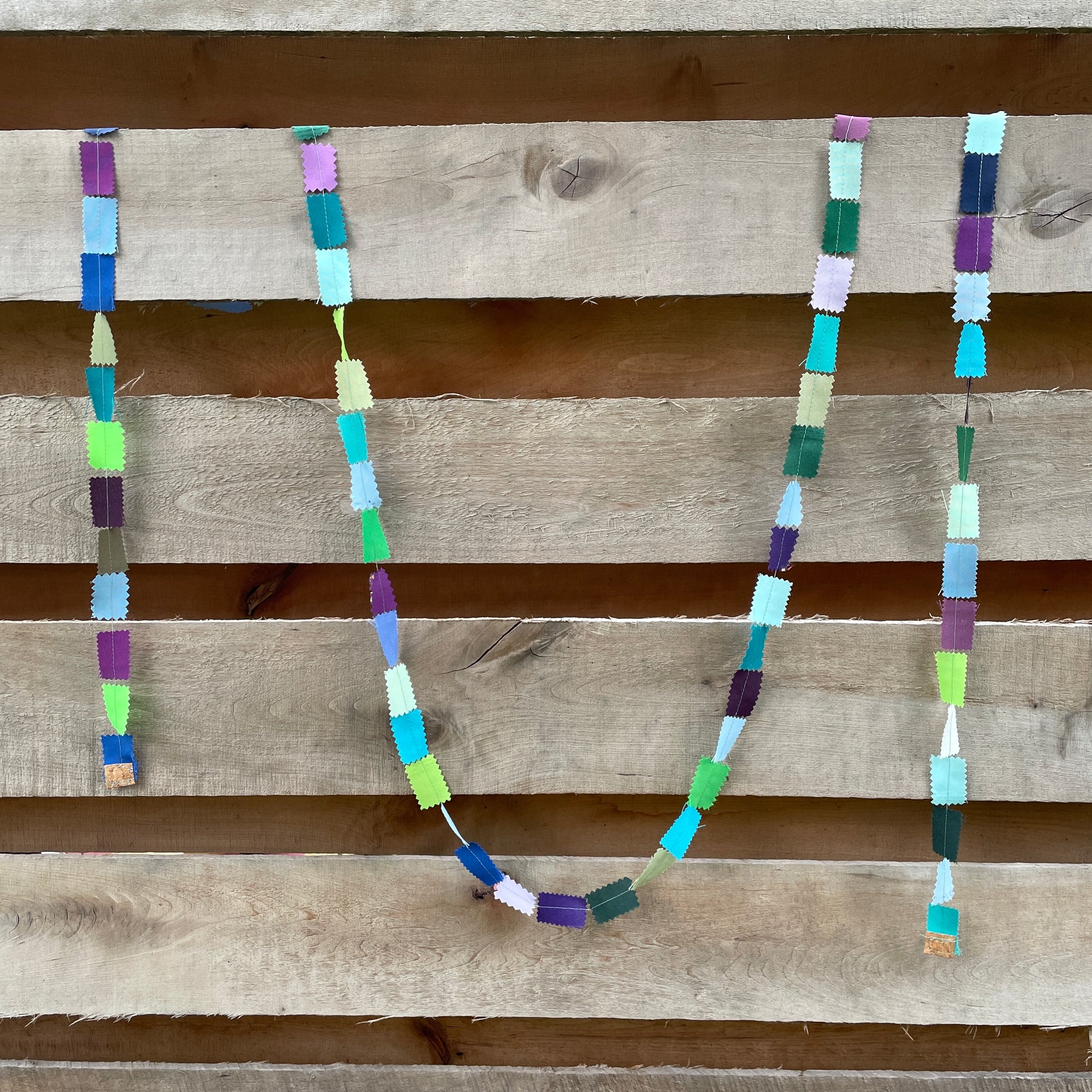 Fabric was removed from sample swatch cards, diverted from the landfill to my fabric stash! Each garland will be one-of-a-kind, in the designated color family.