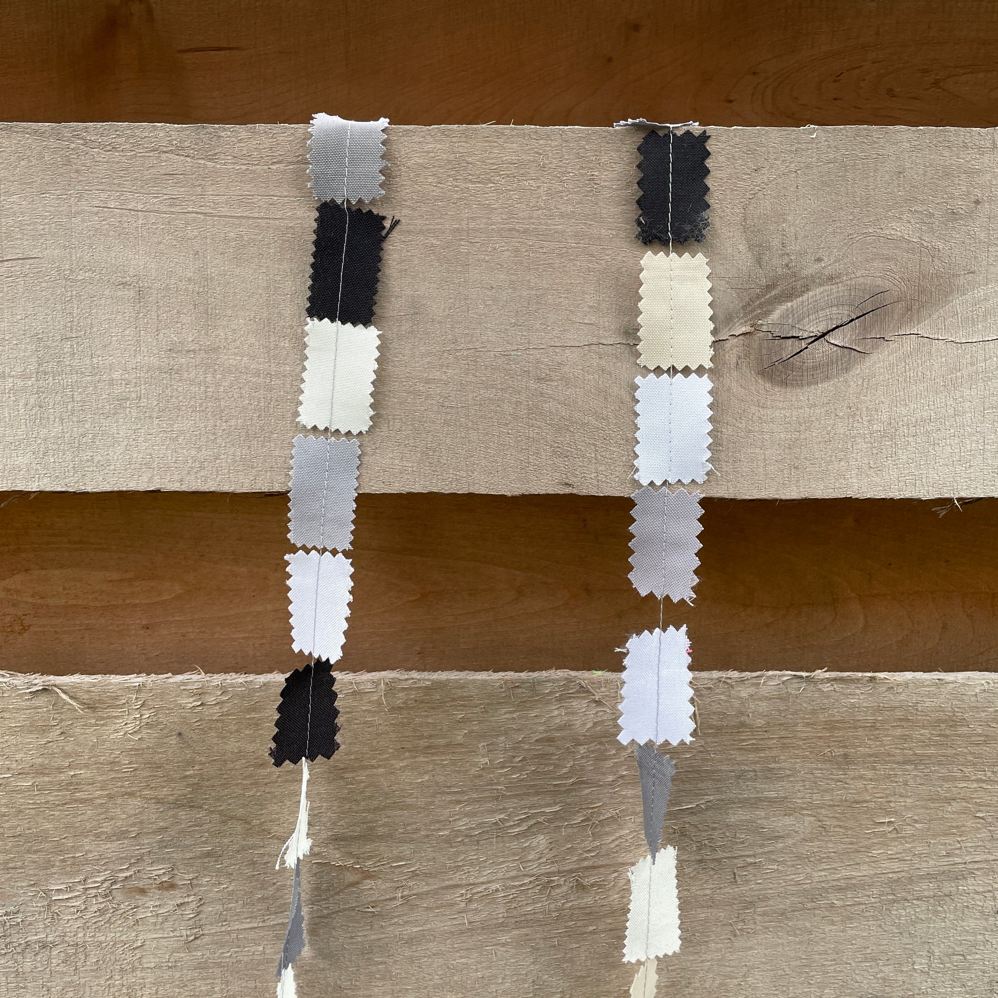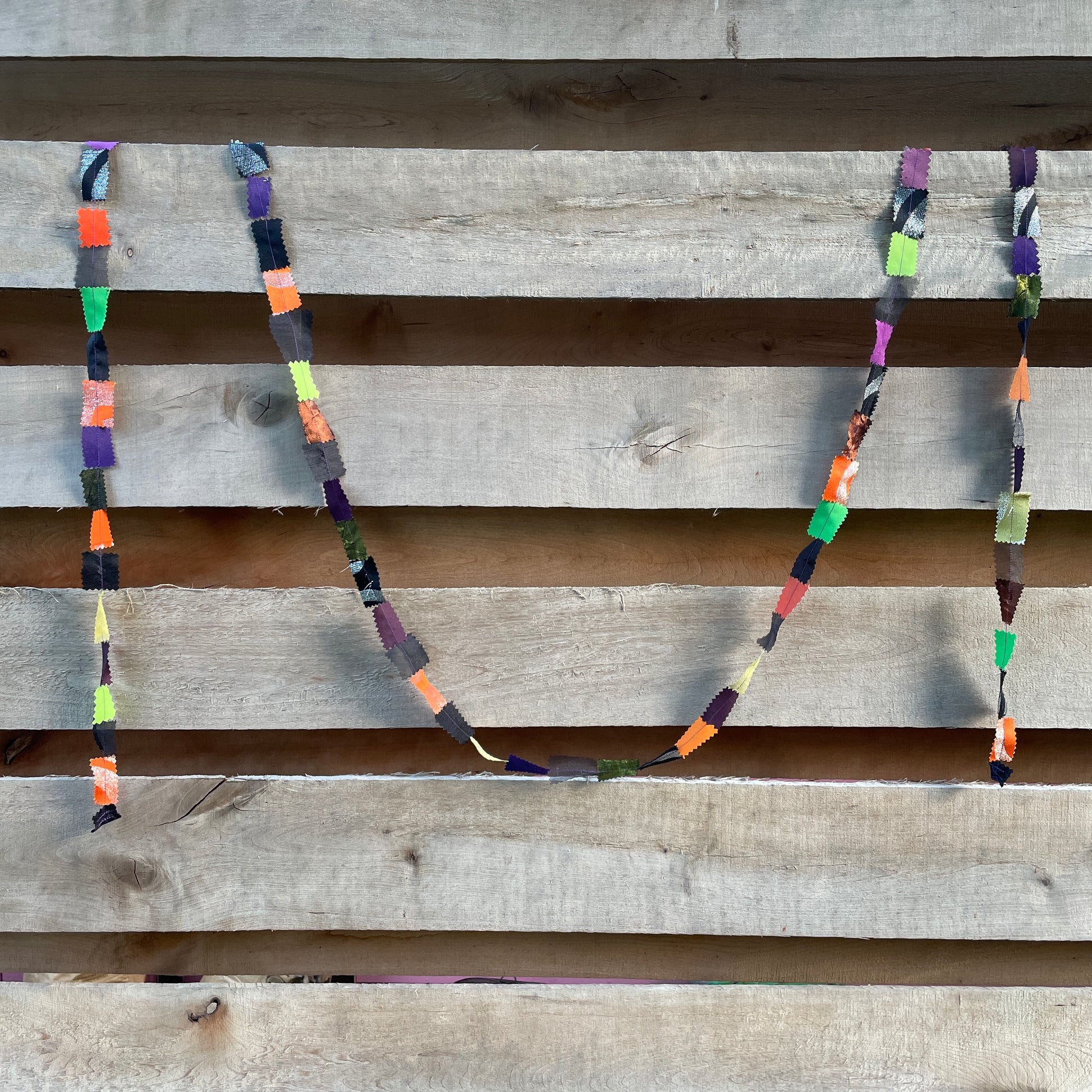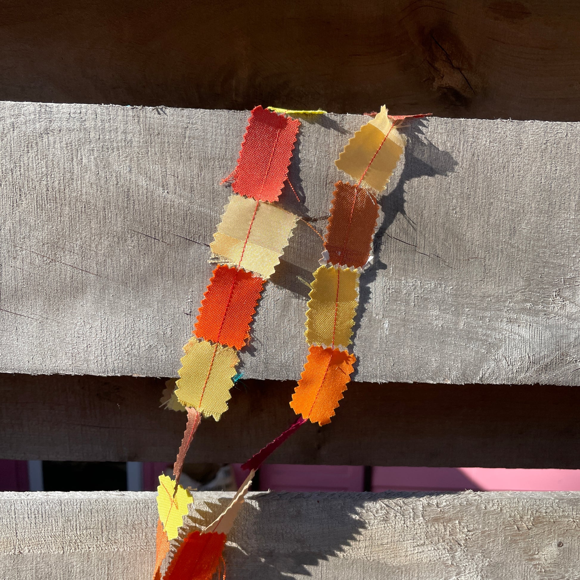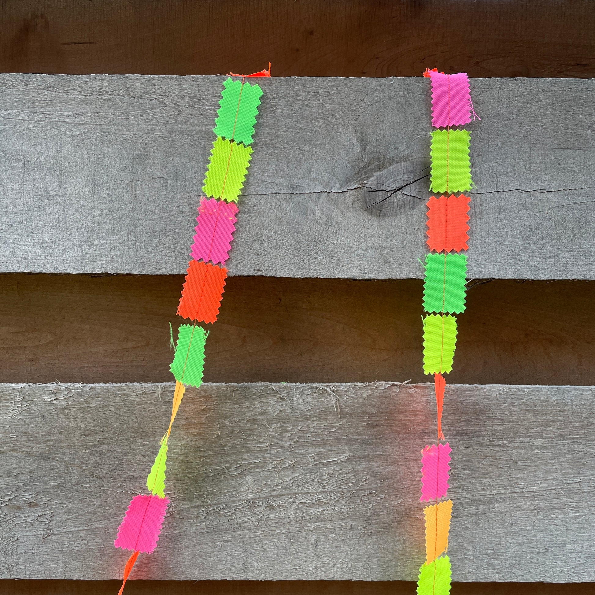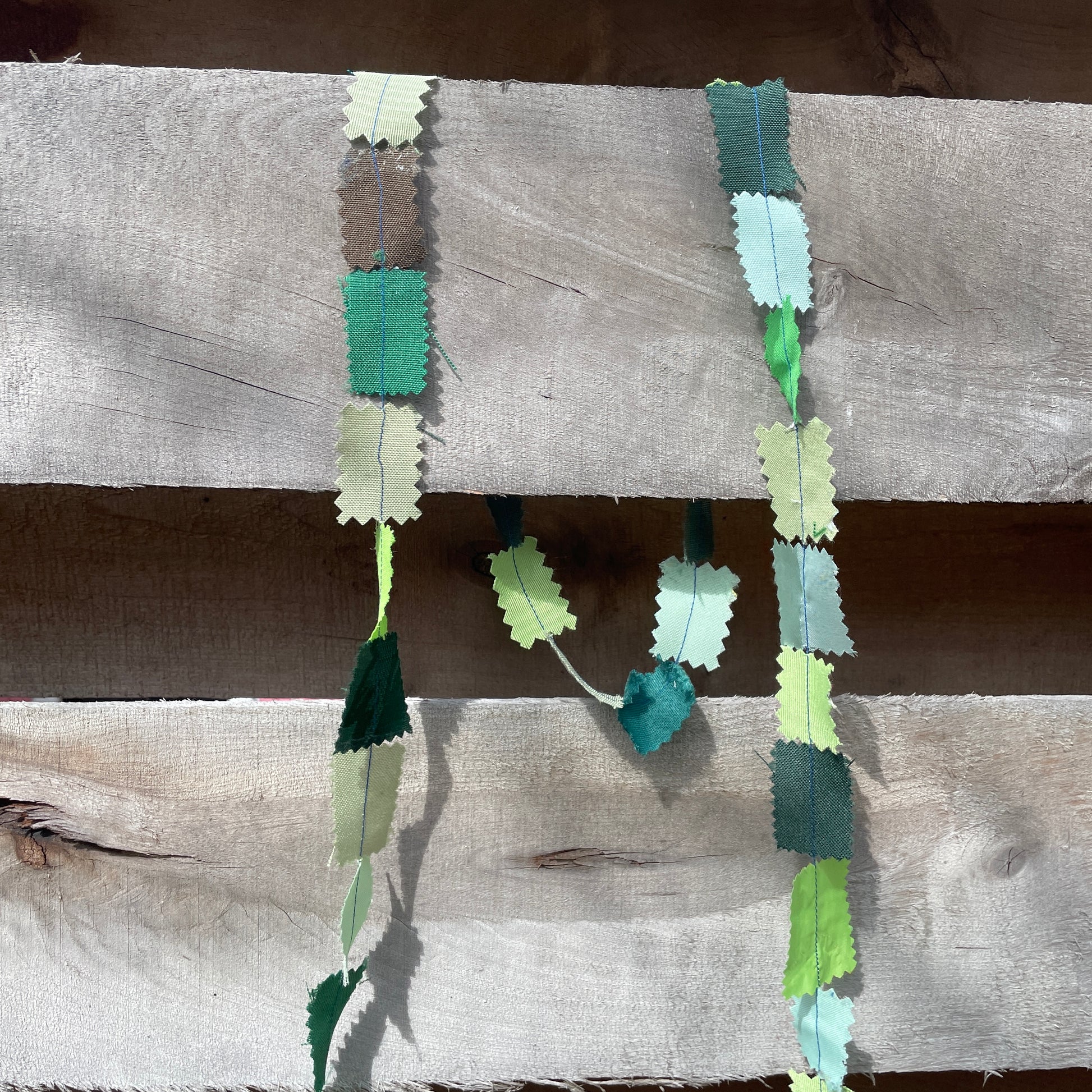 Fabric was removed from sample swatch cards, diverted from the landfill to my fabric stash! Each garland will be one-of-a-kind, in the designated color family.