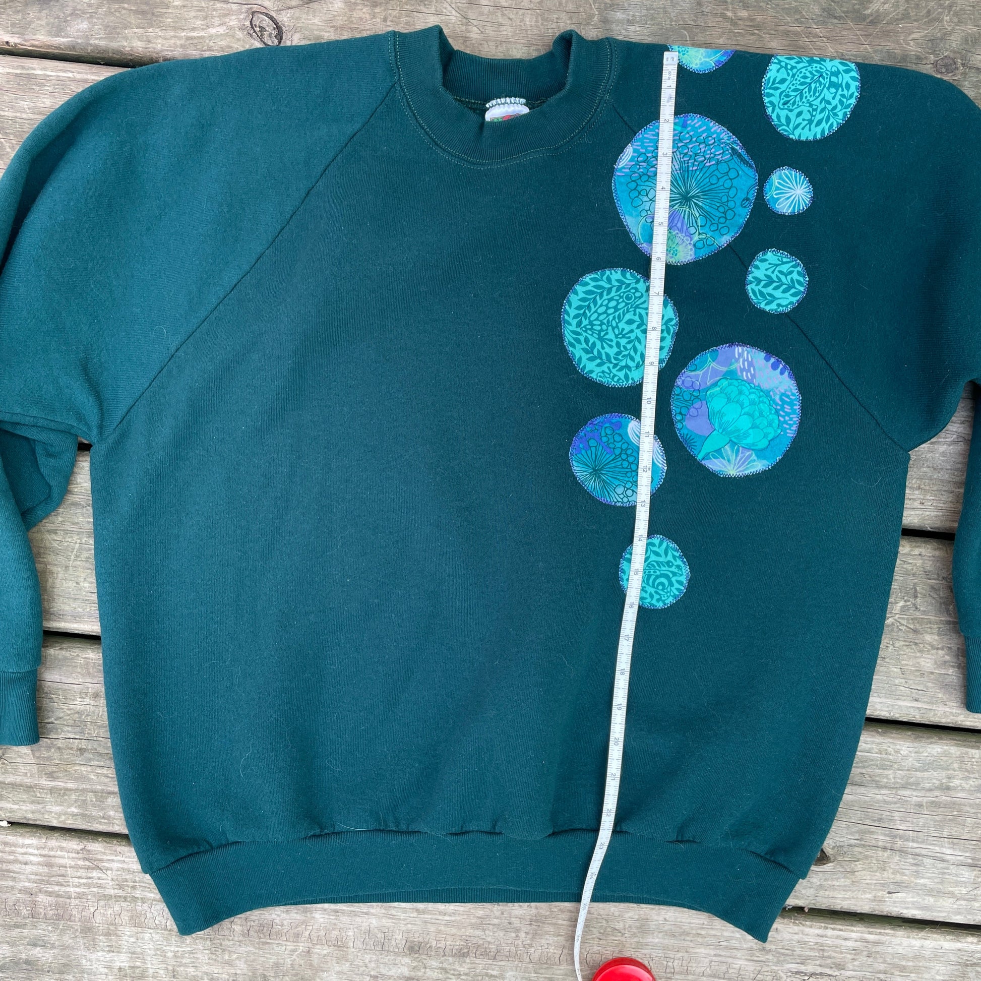 This secondhand sweatshirt has been elevated with a colorful floral & frog appliqué.