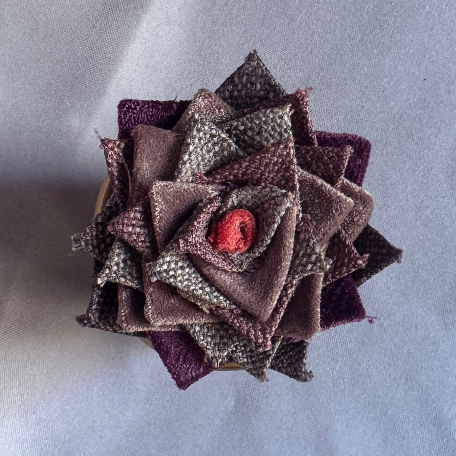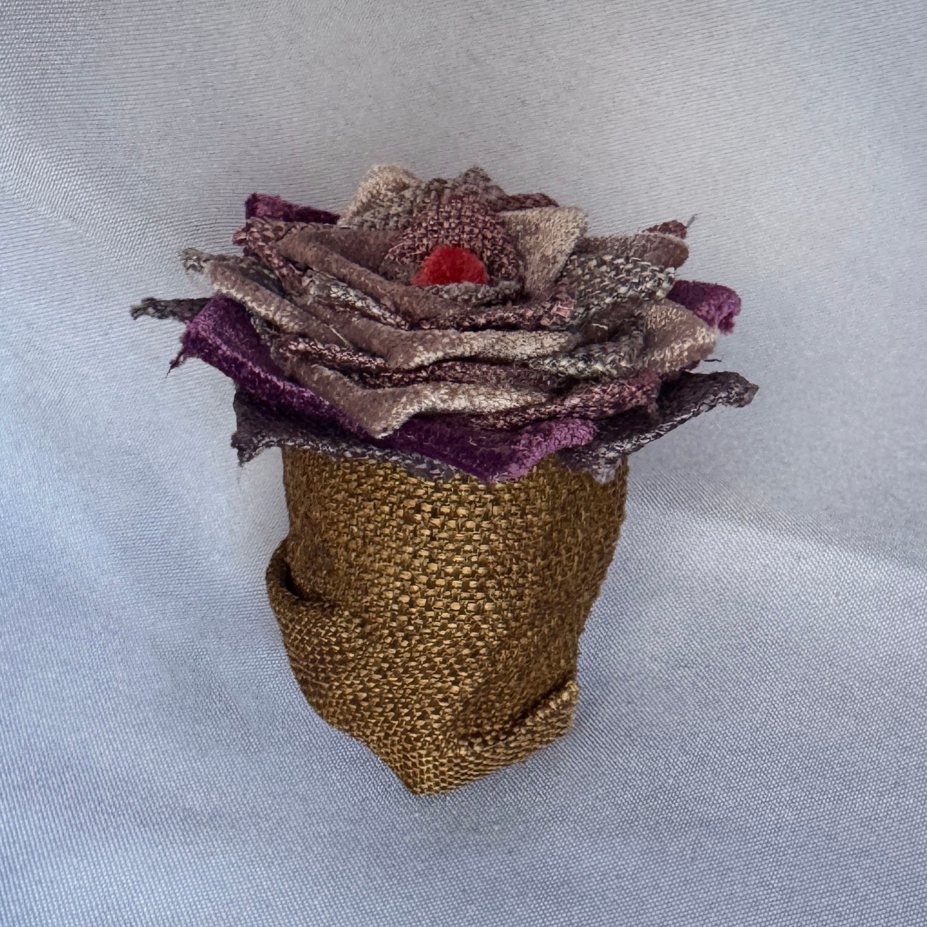 A funky plant made with velvet & other fabric scraps in a secondhand pot. This plant lives forever! The plant and stand are not attached to the pot so it can be placed in a different container if you choose.
