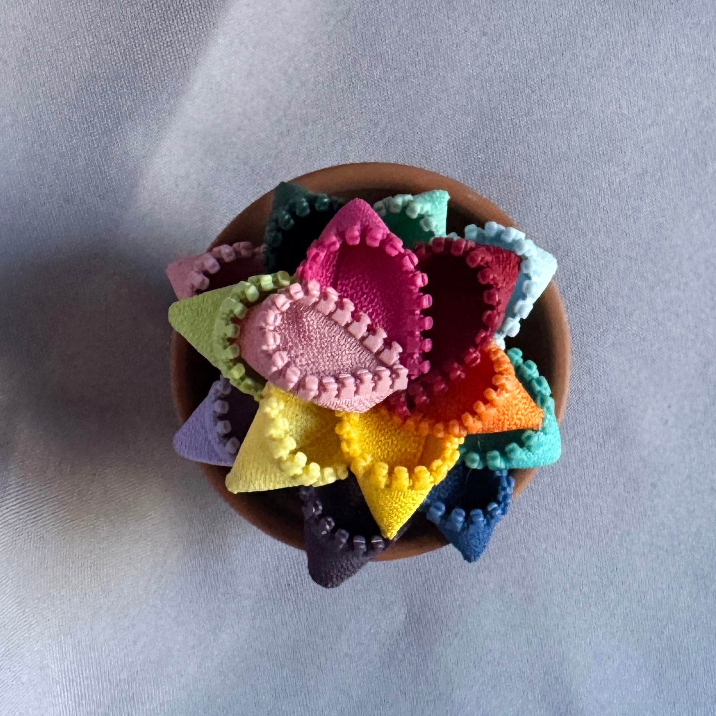 Succulent made with zipper ends and upholstery samples in a secondhand pot. This plant lives forever! The plant and stand are not attached to the pot so it can be placed in a different container if you choose.