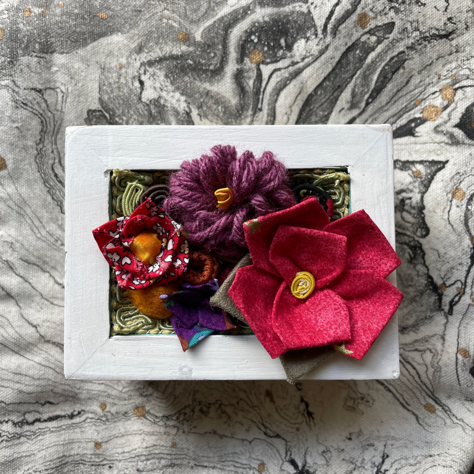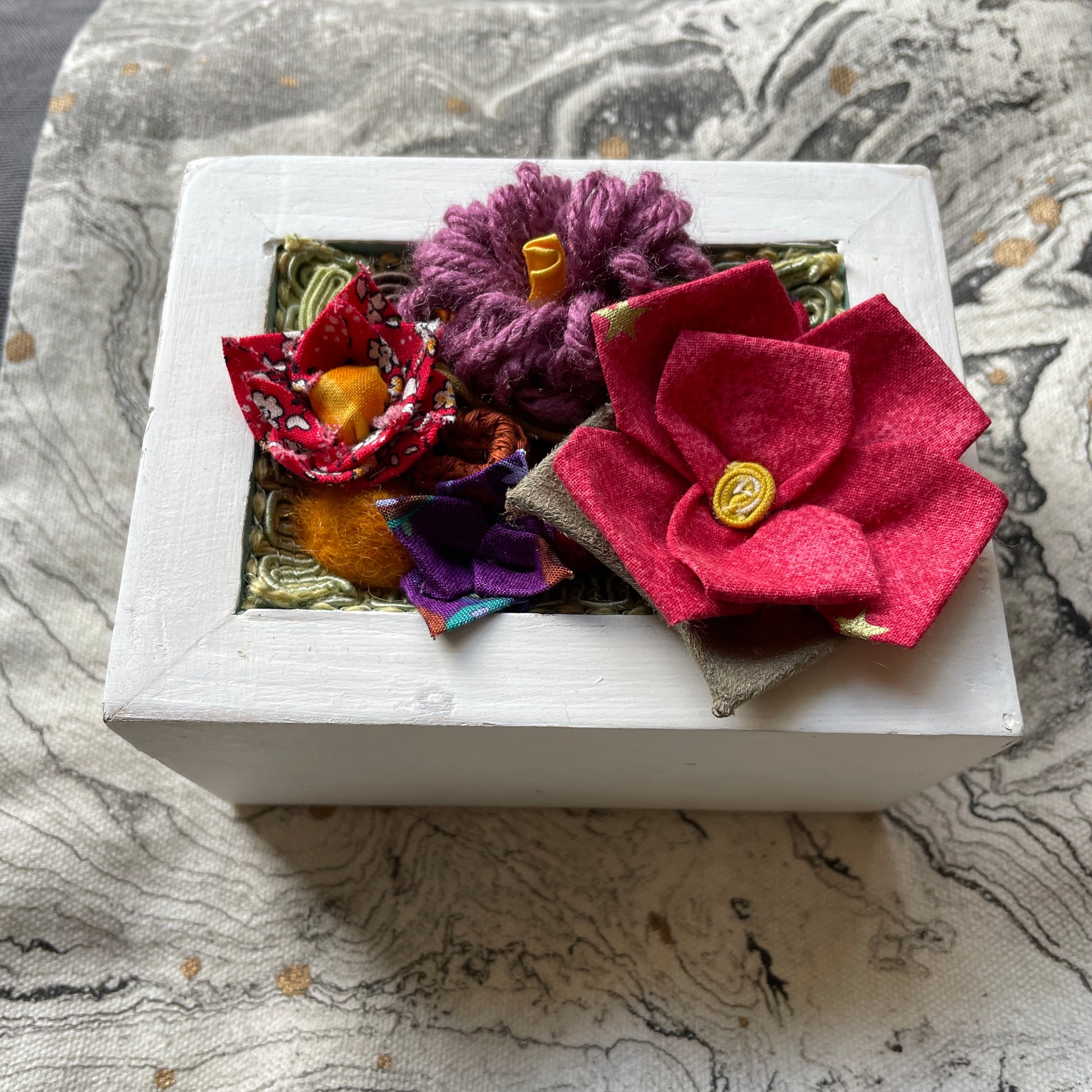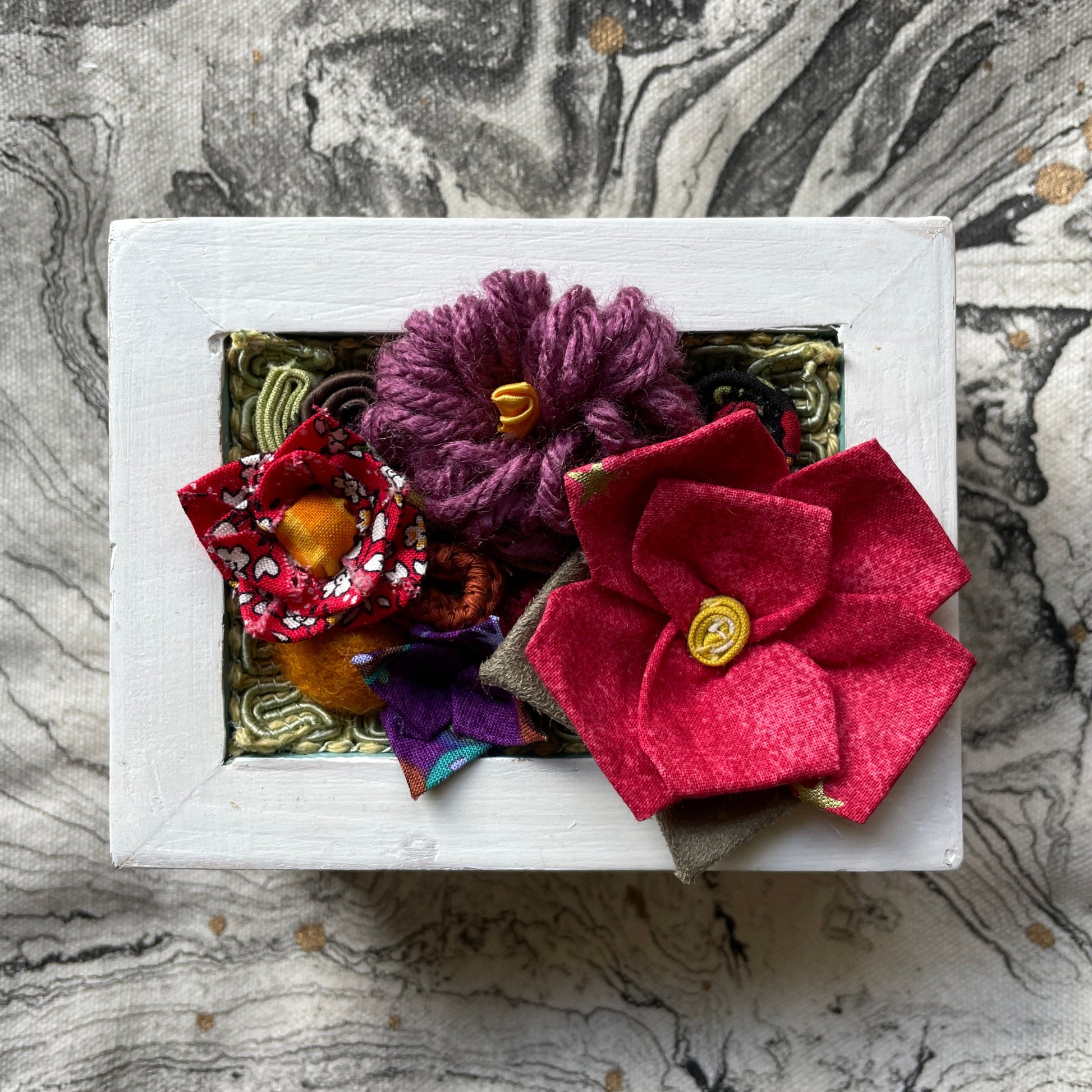 Materials include: quilting scrap, upholstery swatches, velvet, yarn scrap, and other fabric bits and bobs.